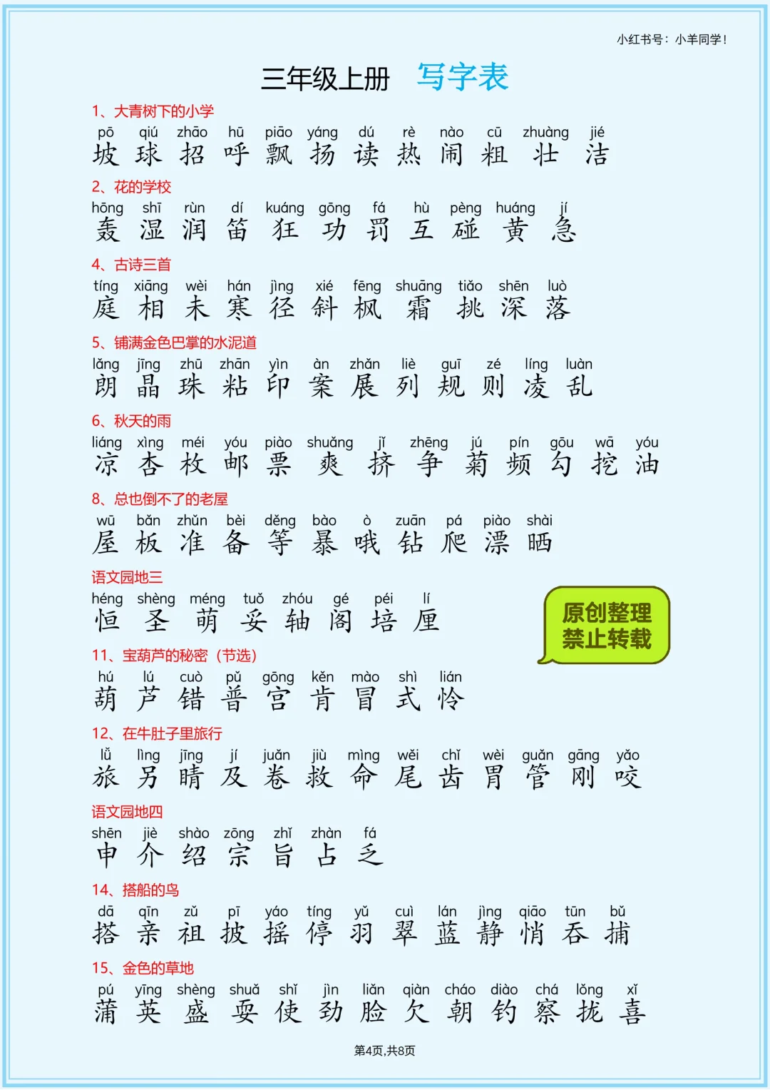 📢紧急通知!2025 秋季版三年级上册课后三表(带注音版)终于敲定啦~ 谁懂啊家人们!改版这事儿真是熬人,天天被催更的心焦到不行😭 现在总算尘埃落定,新鲜出炉的版本已经安排上! 带注音这点真的太贴心,低年级娃用着超方便,课后巩固知识点稳稳的~ 💥敲黑板!近期已经入手过三上三表的宝子们,直接找课后就能免费领新版哦!不用二次消费,这波必须给咱们老粉安排明白~ 需要的宝妈抓紧啦,早入手早用起来,新学期帮娃打好基础~ ⚠️原创整理,禁止转载发布网络平台或商用。