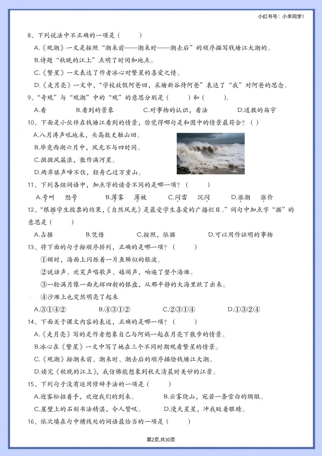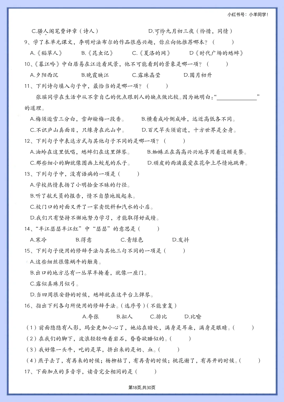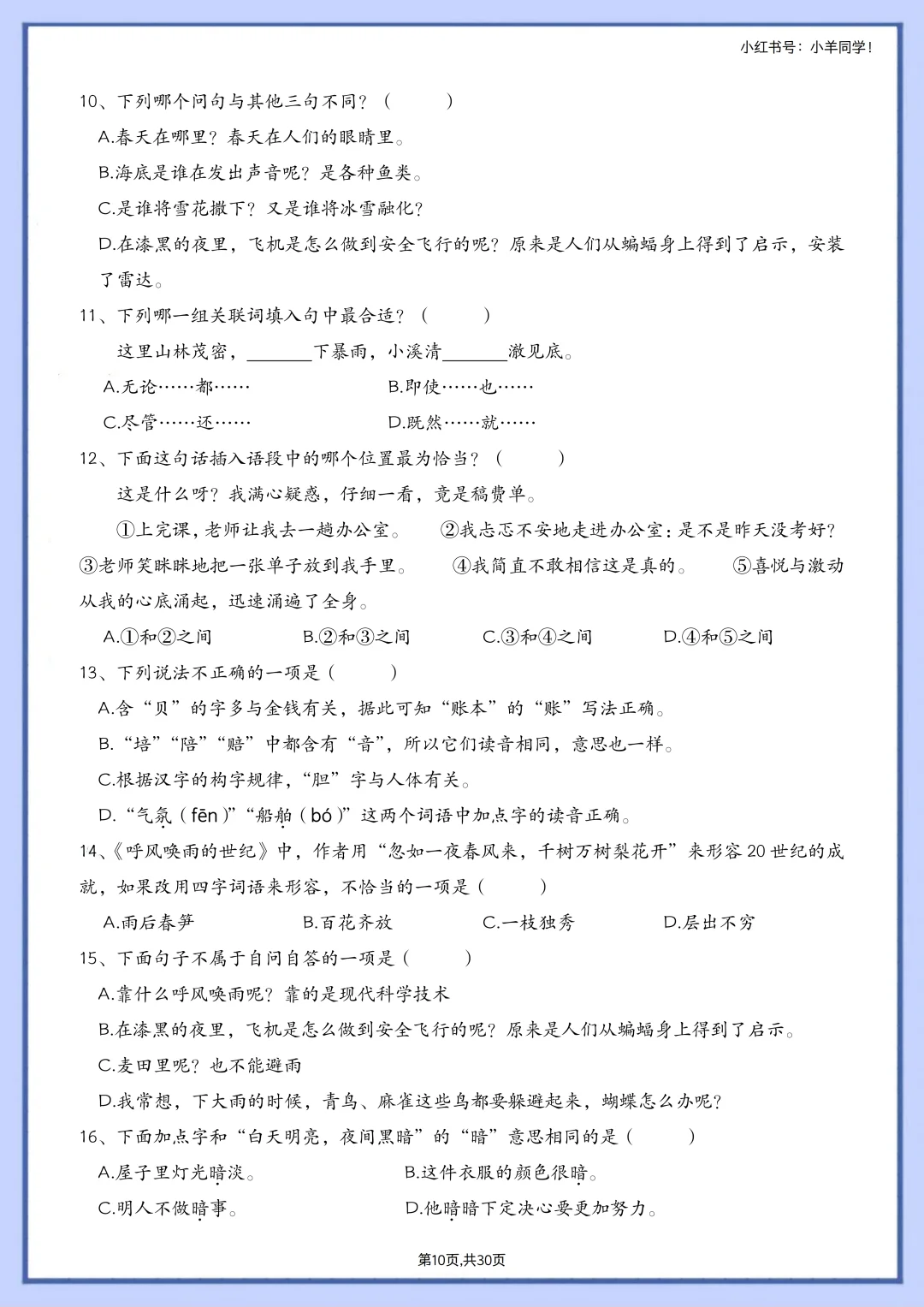 ✅ 别看是选择题,考查范围真的巨广!字音字形、标点符号、拼音练习、诗句理解、修辞手法、口语交际、修改病句、词句段运用、词语辨析、课文理解、句式转换、词语搭配、名句运用、关联词…… 基础知识点几乎全涵盖,一套练透超省心!