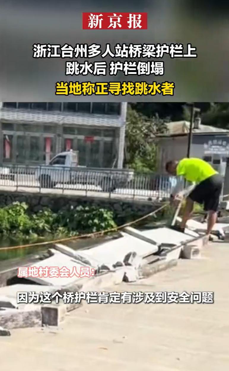 浙江台州,七名跳水爱好者翻上某村老桥上石护栏准备跳水,起初轮流跳水时桥梁尚无异样