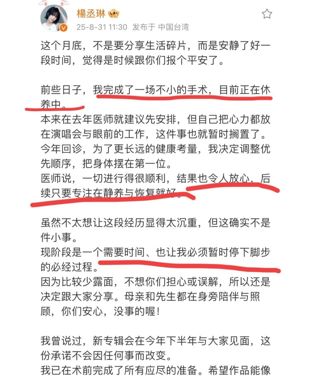 杨丞琳 自爆做了一场不小的手术! 8月31日,歌手杨丞琳用一长段难分难舍的文字表达了自己的现状。由于身体动了手术的原因,自己不得不和大家告别一段时间。 也有网友猜测,她这个手术有可能和耳朵有关,去年巡演有说耳朵听不到声音。也有可能是肩膀问题。 让人羡慕的是她还特意提到生病的这段时间,母亲和先生都陪在身边。看来李荣浩对她真的爱的死心塌地[比心][赞]