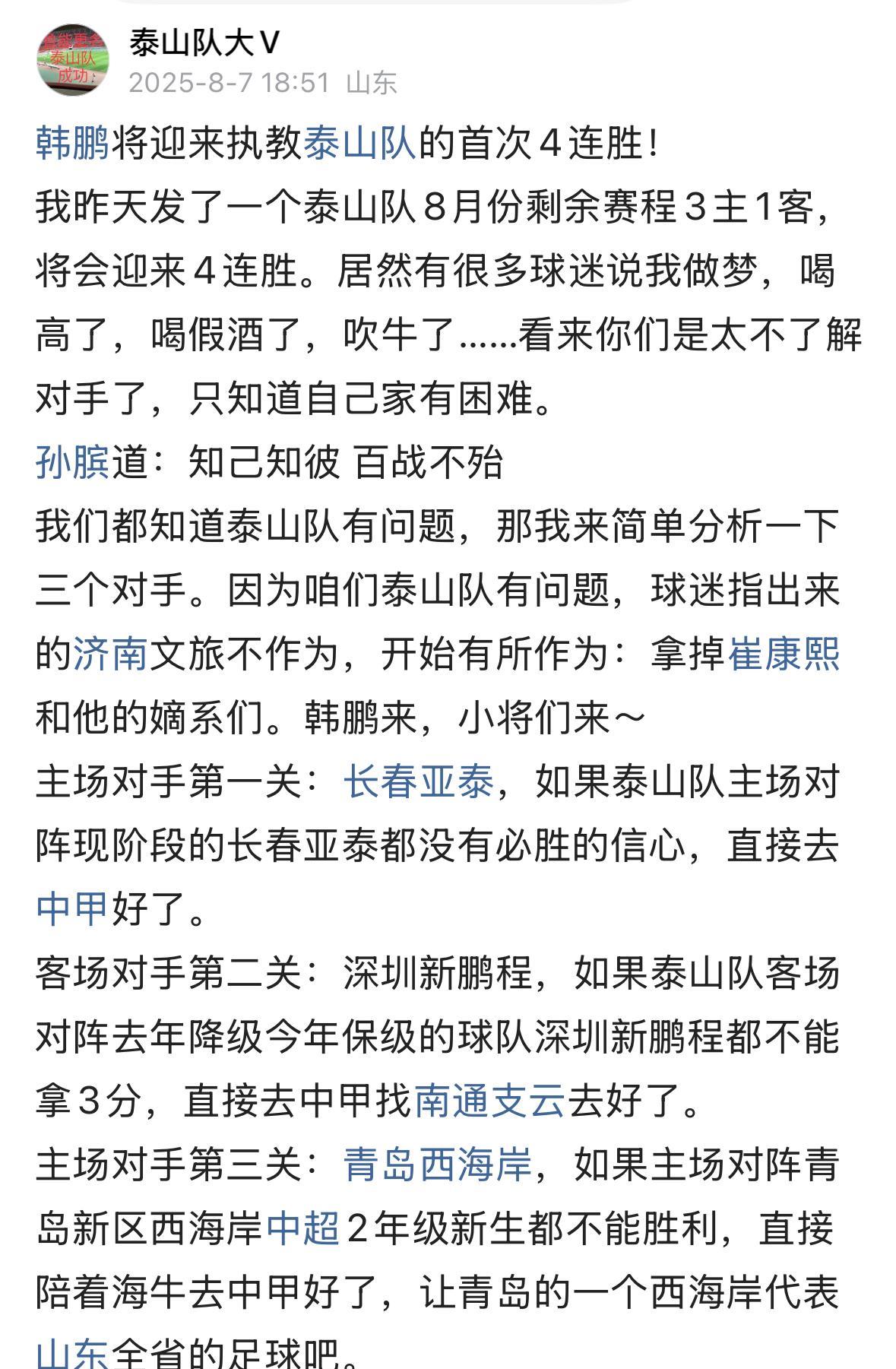 泰山4连胜都是剧本,在月初负蓉城之后,泰山队大V就已经预判了4连胜。 当6:0完