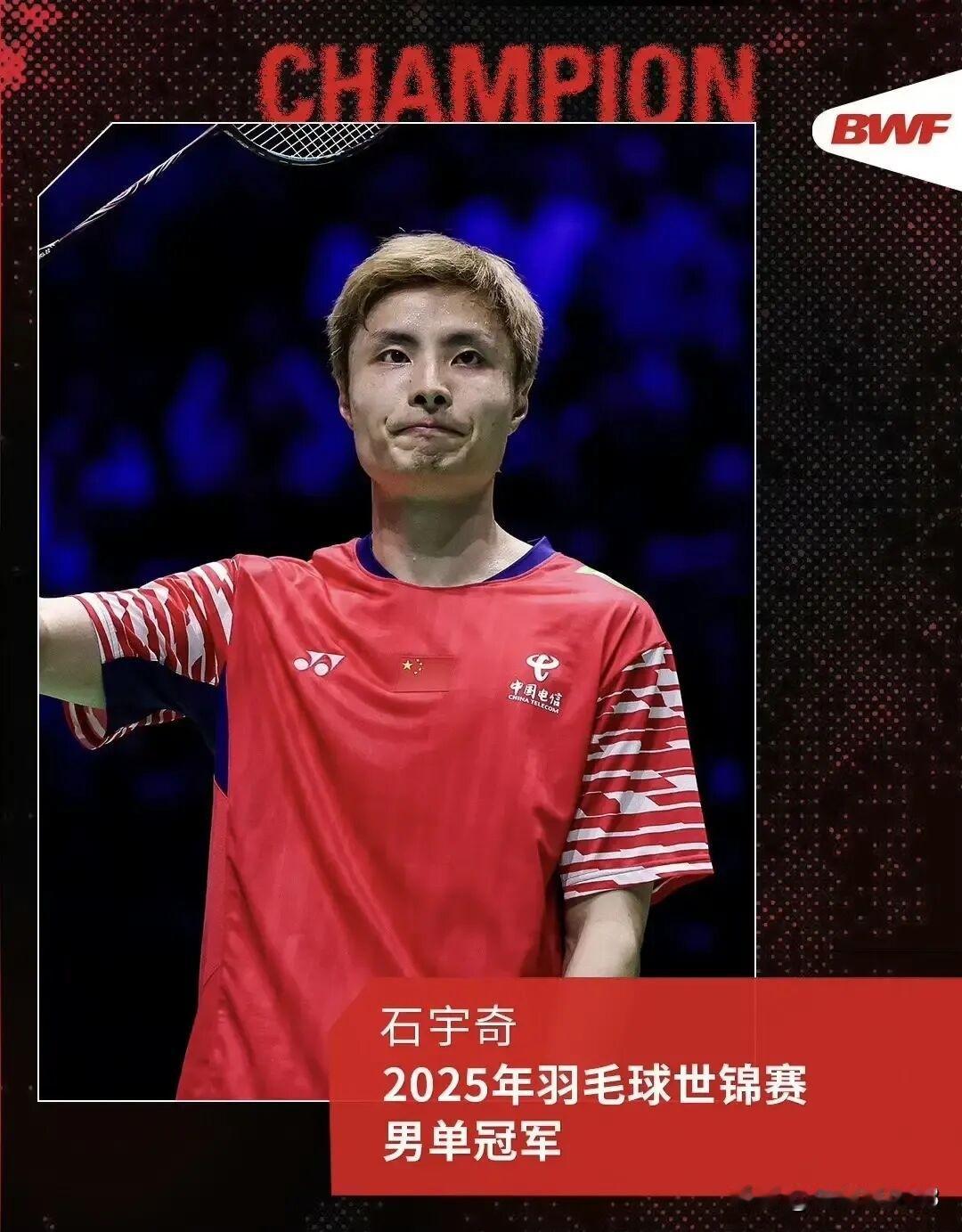 决赛战报-国羽2金3银2025年世界羽毛球锦标赛 31日世锦赛决赛,五星红旗在赛场上升起2次,祝贺国羽取得2金3银的成绩。详细赛况如下: 1、男单:冠军🥇-石宇奇🇨🇳2-1亚军🥈-昆拉武特🇹🇭 2、女单:冠军🥇-山口茜🇯🇵2-0亚军🥈-陈雨菲🇨🇳 3、男双:冠军🥇-徐承宰/金元浩2-0亚军🥈-陈柏阳/刘毅🇨🇳 4、女双:冠军🥇-刘圣书/谭宁🇨🇳2-1亚军🥈-陈康乐/蒂娜🇲🇾 5、混双:冠军🥇-陈堂杰/杜颐沩🇲🇾2-0亚军🥈-蒋振邦/魏雅欣🇨🇳