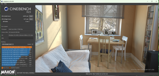 CINEBENCH R23测试,英特尔® 酷睿™ Ultra 7 270K Plus 单核2411pts,相比9700X提升10.1%,相比265K提升7.5%;全核42991pts,相比9700X提升123.0%,相比265K提升28.1%。单核性能提升更加明显。