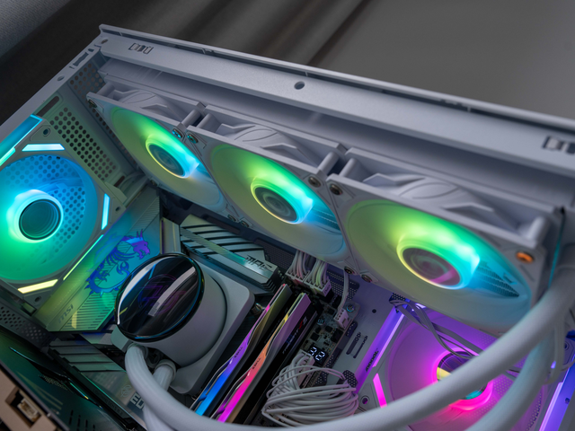 屏幕之下是其扎实的散热内核。冷头采用一体化曲面玻璃盖板设计,线缆巧妙隐藏,外观整洁利落。内部配备高性能水泵与大面积纯铜底座,确保热量快速传导。搭配三把环刃高效静音风扇,兼顾强劲风量与低噪运行,为英特尔® 酷睿™ Ultra 7 270K Plus在高负载下的稳定输出提供可靠保障。