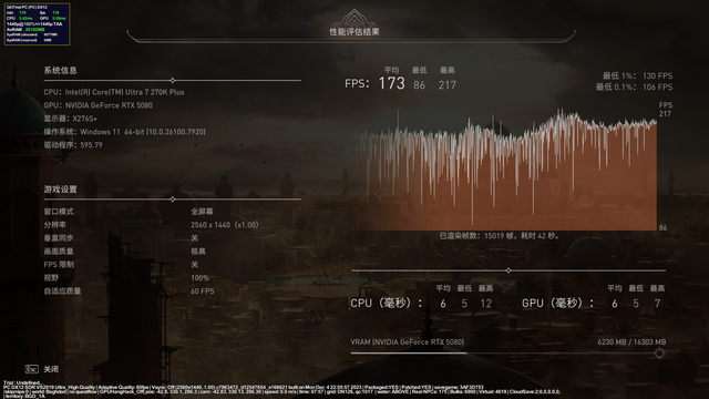 《刺客信条幻景》2K分辨率,画质极高,平均帧数173,最低帧数86。