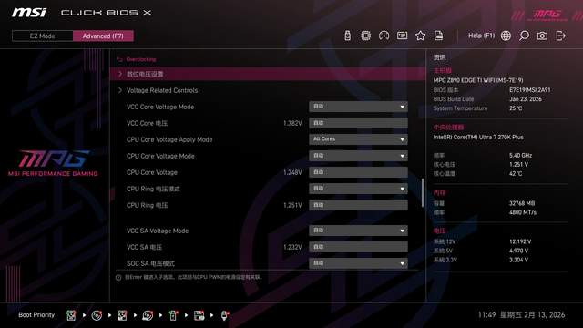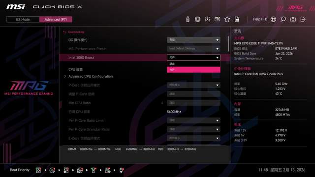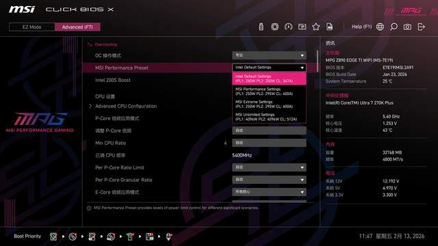在BIOS的Overclocking(超频)页面中,用户可以通过主板预设的选项,轻松完成解锁功耗墙(MSI Performance Preset)和一键超频(Intel 200S Boost)操作。