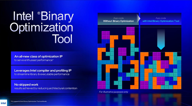 基于APO,英特尔还推出了最新的英特尔二进制优化技术(Intel® Binary Optimization Tool,简称iBOT),可以自动识别支持的游戏,对其实现动态优化和重构,由此更好的提高计算效率,实现更高的 IPC,也就拥有更好的游戏表现。