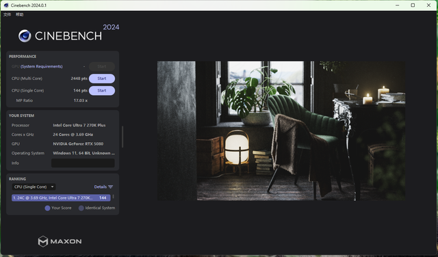 CINEBENCH 2024测试,英特尔® 酷睿™ Ultra 7 270K Plus 单核144pts,相比9700X提升9.1%,相比265K提升4.4%;全核2448pts,相比9700X提升119.2%,相比265K提升25.9%。