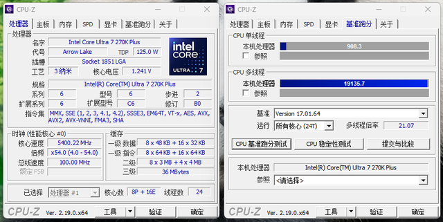 CPU-Z测试,英特尔® 酷睿™ Ultra 7 270K Plus 单核908.3,相比9700X提升5.0%,相比265K提升2.7%;全核19135.7,相比9700X提升148%,相比265K提升27%。单核有小幅提升,而全核的提升幅度相当明显。