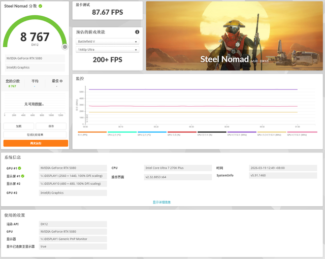 Steel Nomad测试,得分为8767,索泰 RTX 5080 SOLID CORE OC的表现非常稳定。
