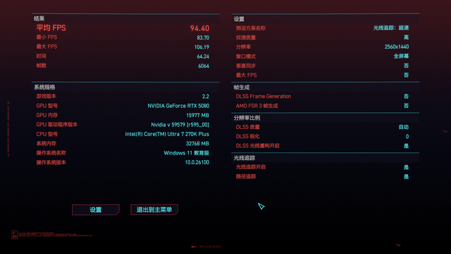 《赛博朋克:2077》2K分辨率,采用管线追踪:超速预设,平均帧数为94.40,最低帧数为83.7,毫无压力。