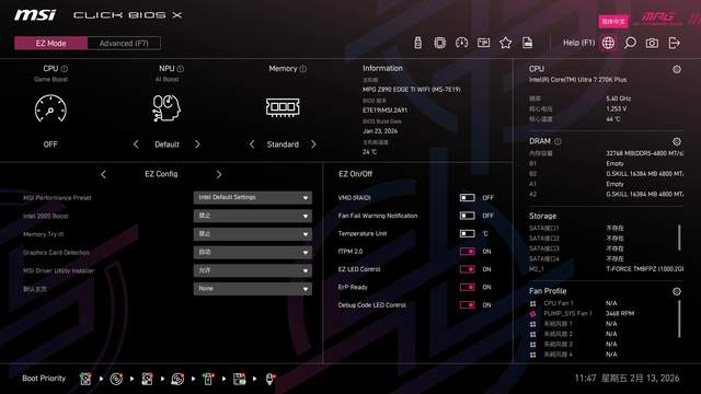 微星MPG Z890 EDGE TI WIFI 刀锋钛主板的BIOS界面布局简约、逻辑清晰。常用功能如:EXPO内存超频、PBO性能优化、风扇模式调节,都可以在EZ MODE模式下轻松找到,方便用户轻松定位并完成所需要的操作。