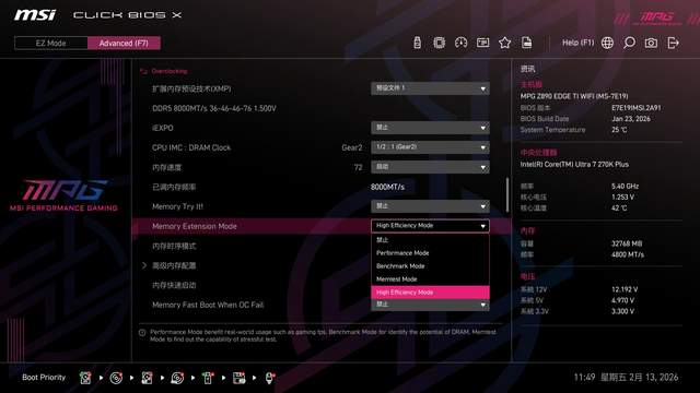 对于大多数用户来说,只需要进入到内存设置页面,开启EXPO即可。我们可以看到微星提供了丰富的设置选项,还有高带宽模式,让用户一键获得内存自动优化的性能释放。在这里我们打开Gear2模式,开启EXPO让内存频率调整至预设的8000MHz。