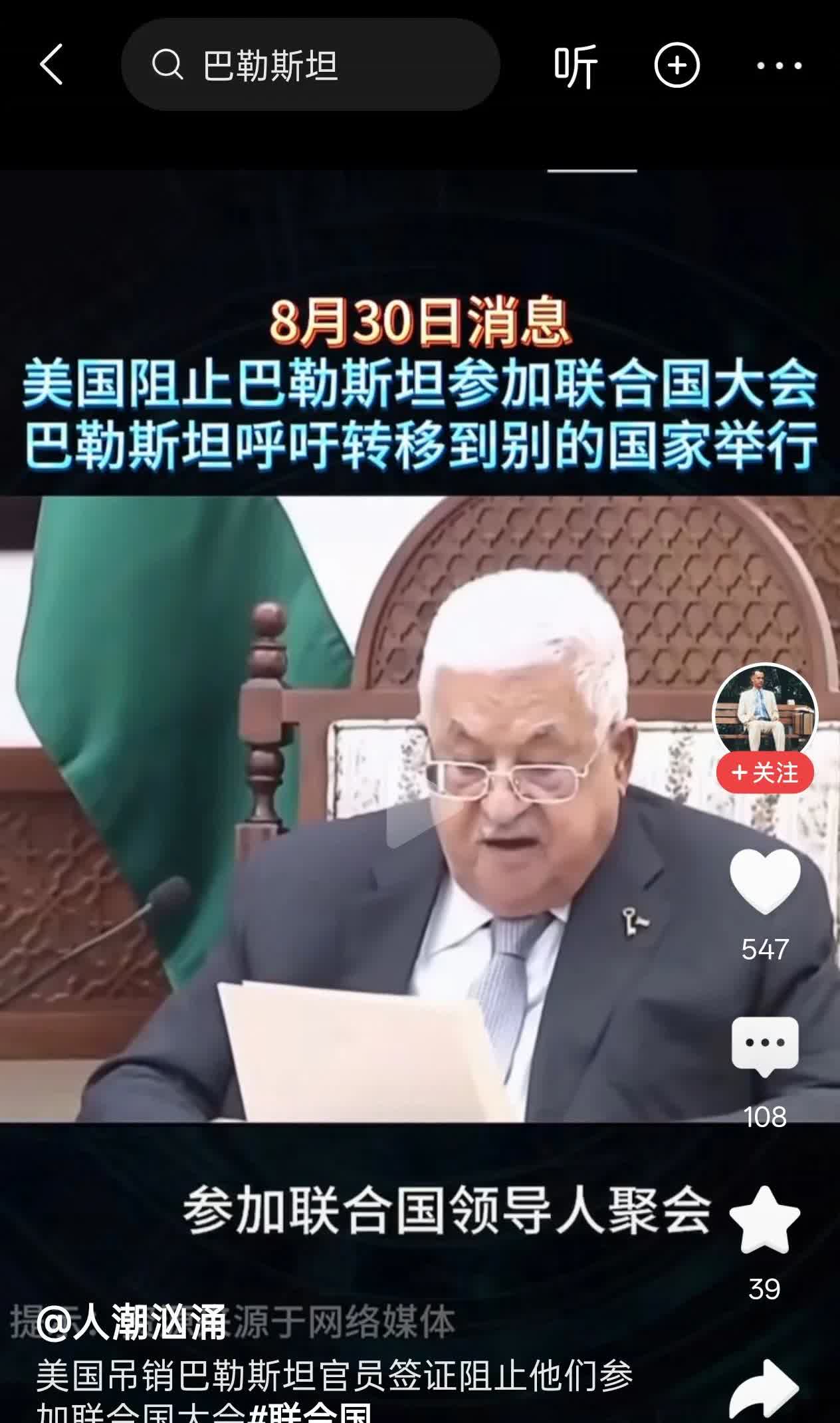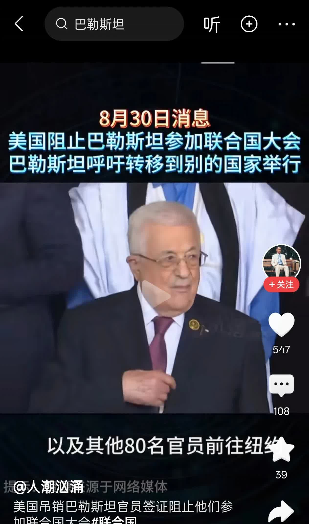 装都不装了,契约精神、文明的画皮也不顾了,直接就不给签证、禁止巴勒斯坦官员参加联
