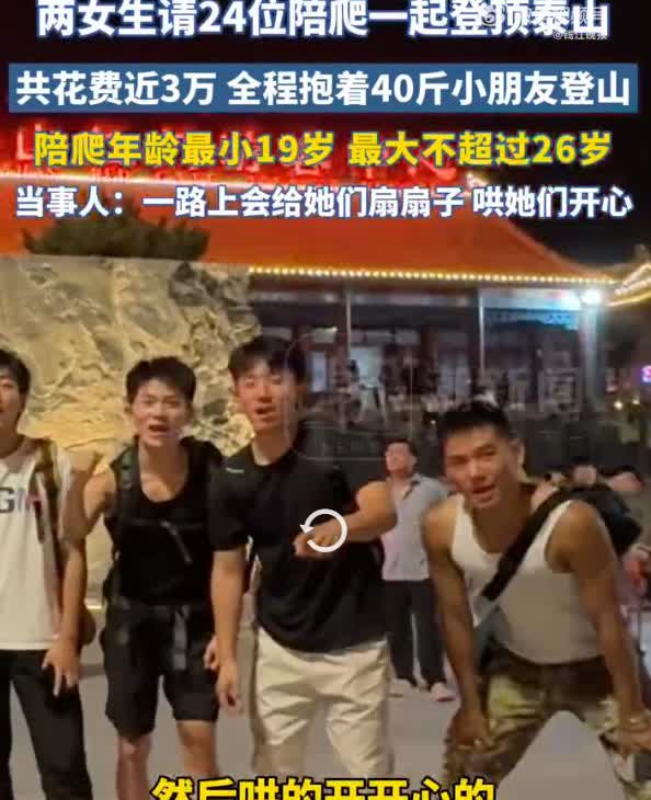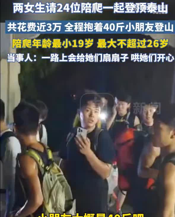 两位女子花费近3万元聘请24名陪爬人员(年龄19-26岁)登顶泰山,服务内容包括背包、扇风、讲笑话、情绪鼓励,甚至轮流怀抱一名40斤的儿童全程登顶(孩子双脚未落地)。当事人郭先生称此举是为“哄雇主开心”。