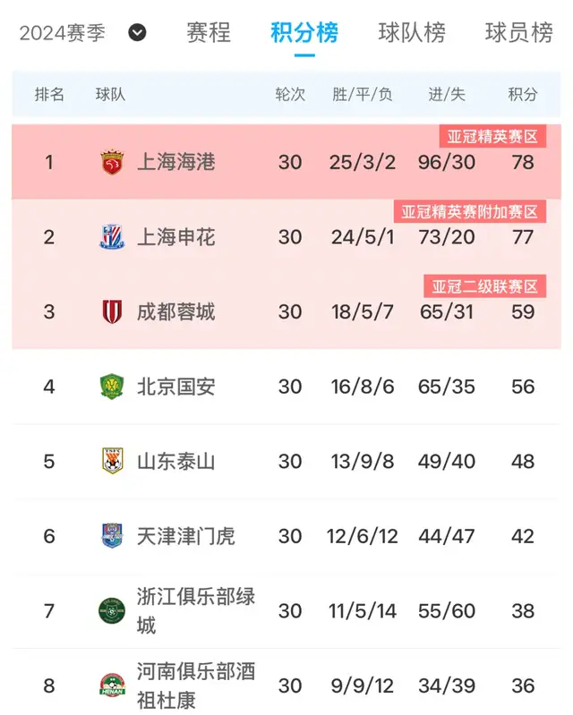 2024年最终排位,海港、申花、蓉城、国安、泰山、津门虎和浙江队;