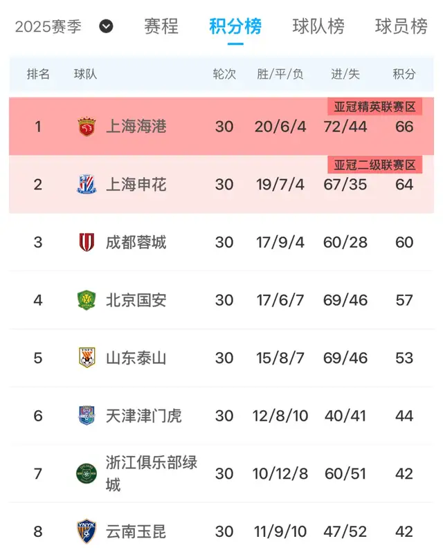 2025年最终排位,依旧是海港、申花、蓉城、国安、泰山、津门虎和浙江队;