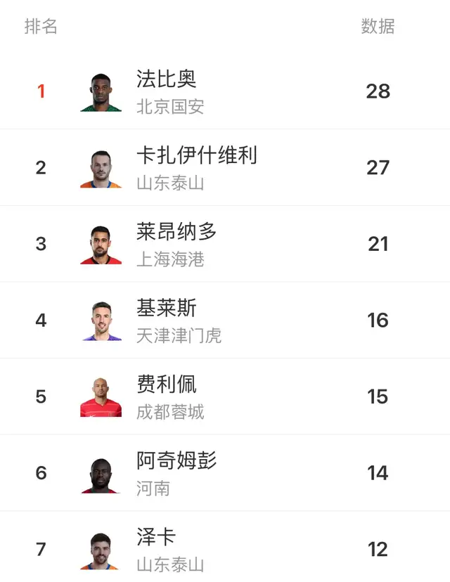 本赛季,国安拿到半程冠军之后,接连遭遇打击,提前退出争冠行列,外援前锋法比奥依旧展现出强劲实力,扛着国安进攻大旗不放弃。最后一轮,法比奥上演大四喜,在射手榜上实现反超,以28球夺得金靴。卡扎伊什维利(山东泰山)以27球获得银靴。王钰栋(浙江队)以11球成为本土最佳射手。