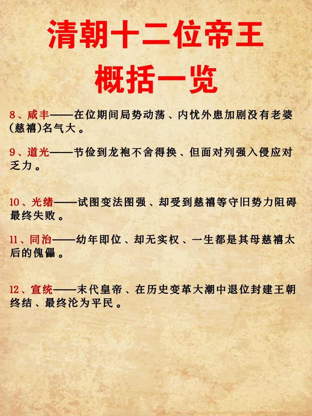 📖清朝的十二位皇帝,有的功勋卓著,他们凭借自己的智慧和勇气,重塑了清朝的版图与命运。 👉然而,也有皇帝因决策失误,导致朝代逐渐走向衰败。 👉在这十二位皇帝中,谁的功绩最为显著,能够站在历史的高位之上呢?
