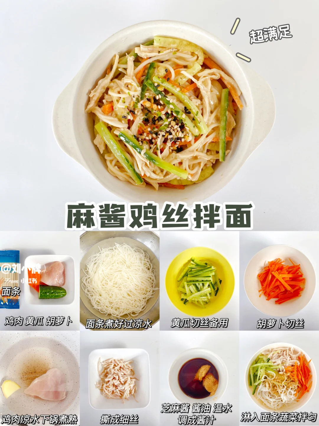 鸡肉、黄瓜、胡萝卜、面条、芝麻酱或花生酱