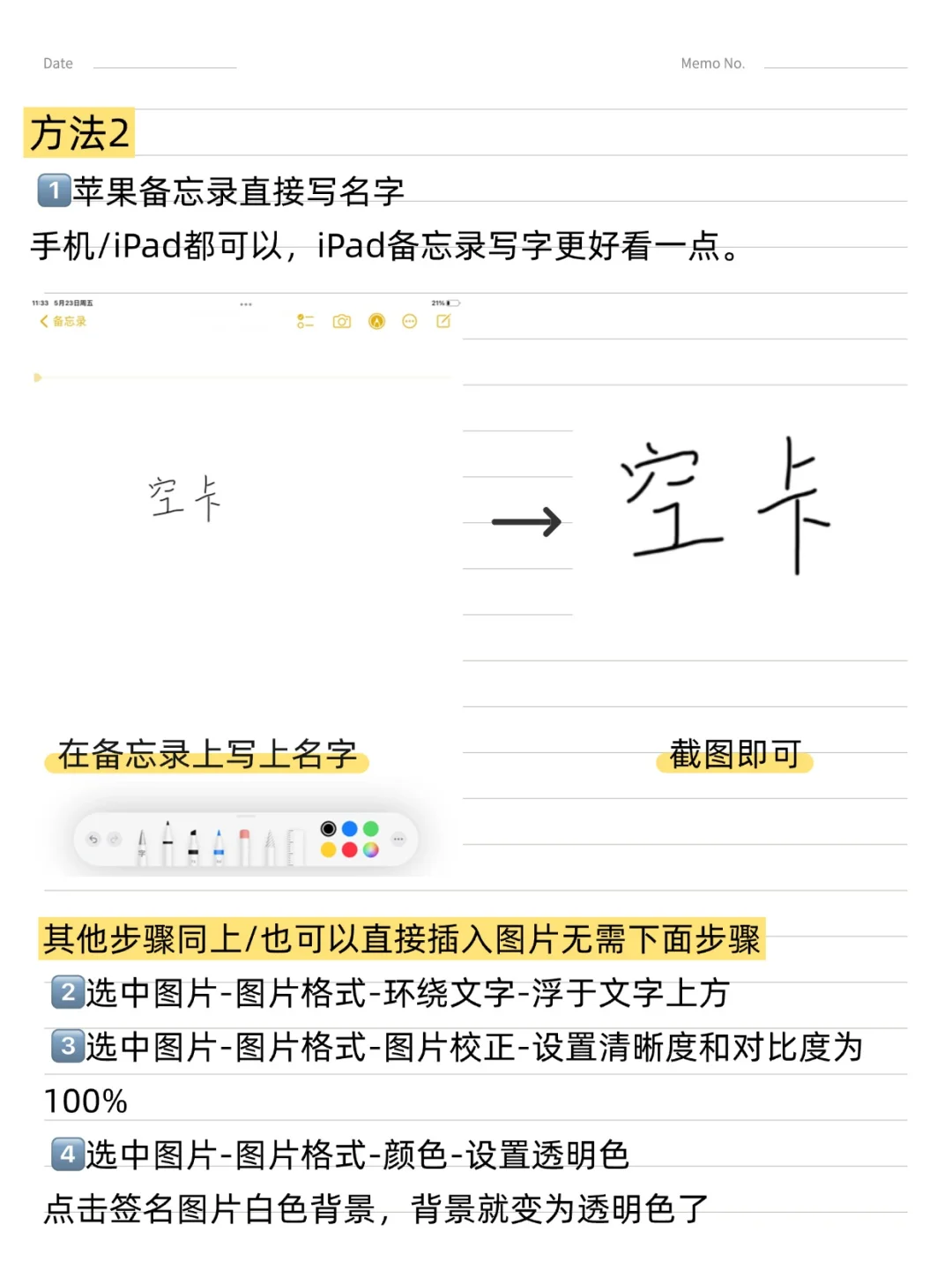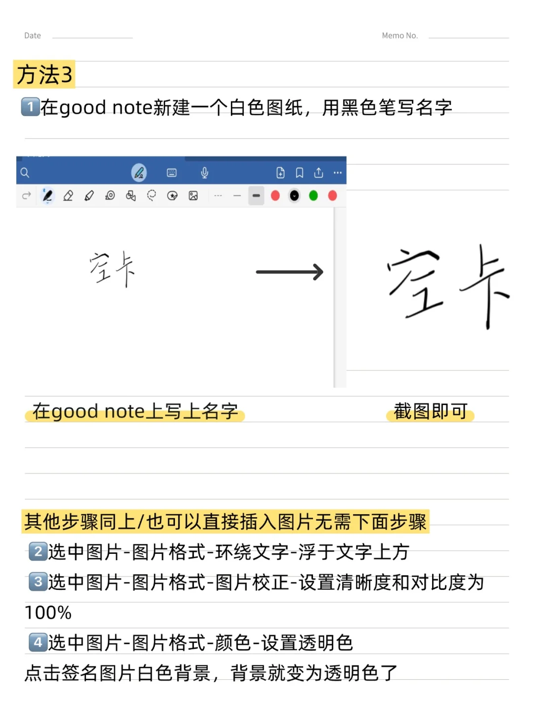 [彩虹R] 方法1 [一R]白纸上写下名字,拍照发到电脑上,下载图片插入word中 (注意纸上最好不要有小黑点,越白越好) [二R]选中图片-格式-环绕文字-浮于文字上方 [三R]选中图片-格式-校正-设置清晰度和对比度为100% [四R]选中图片-格式-颜色-设置透明色 [彩虹R] 方法2 手机备忘录直接写字,截图就是白底黑字电子签啦 [彩虹R] 方法3 good note写字,找个白纸,黑色钢笔,电子签搞定✅ 毕业论文电子签名制作步骤 电子签名 大学生干货