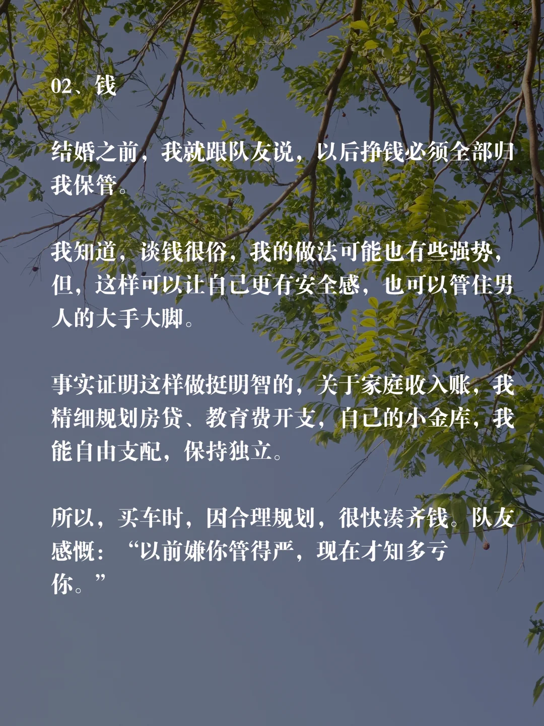 事实证明这样做挺明智的,关于家庭收入账,我精细规划房贷、教育费开支,自己的小金库,我能自由支配,保持独立。