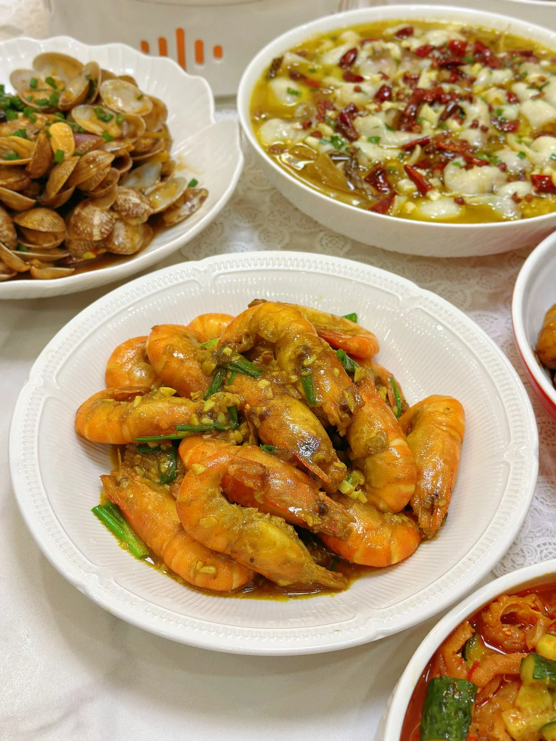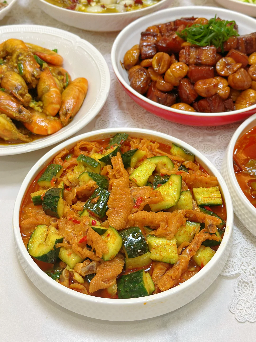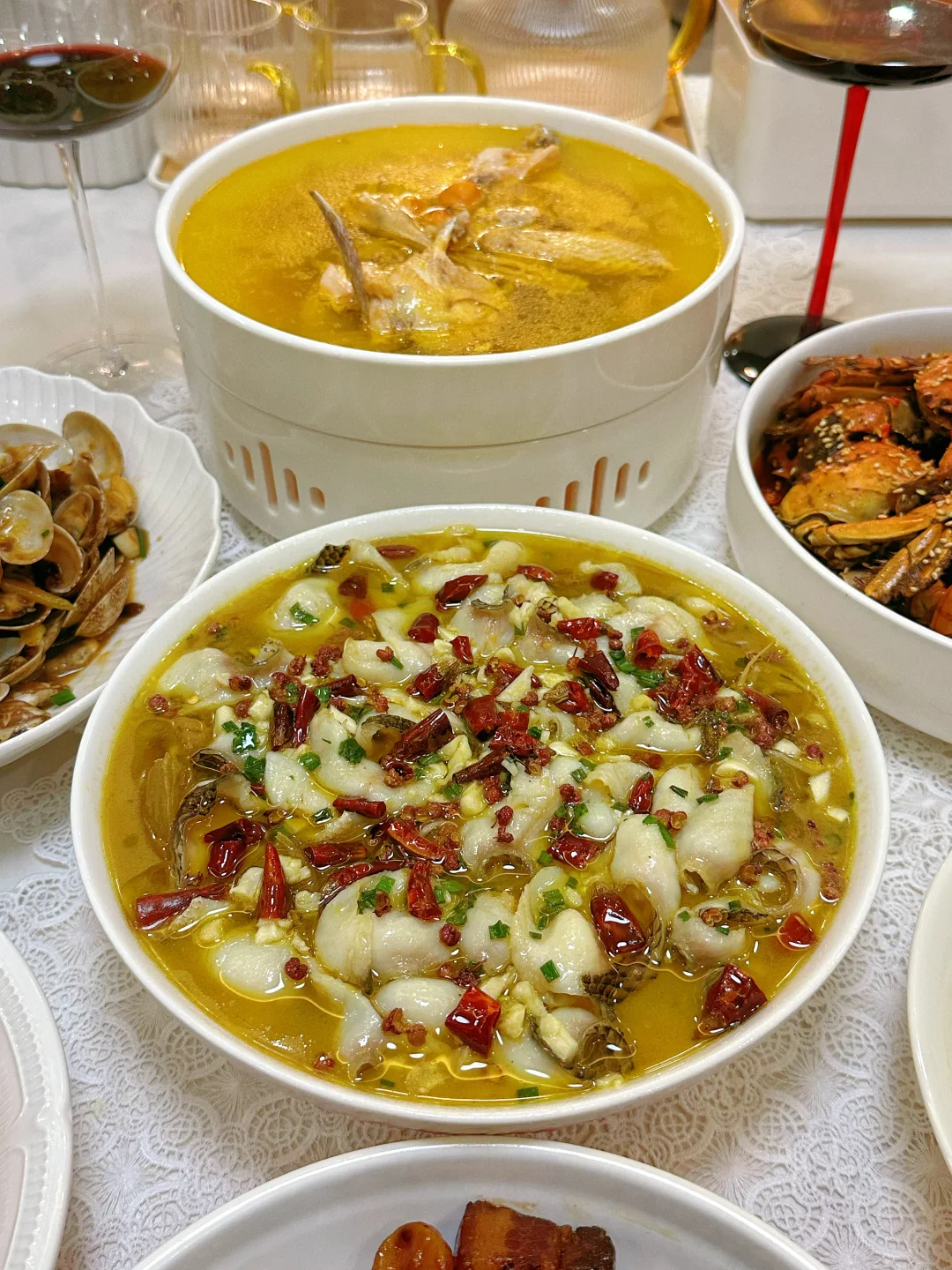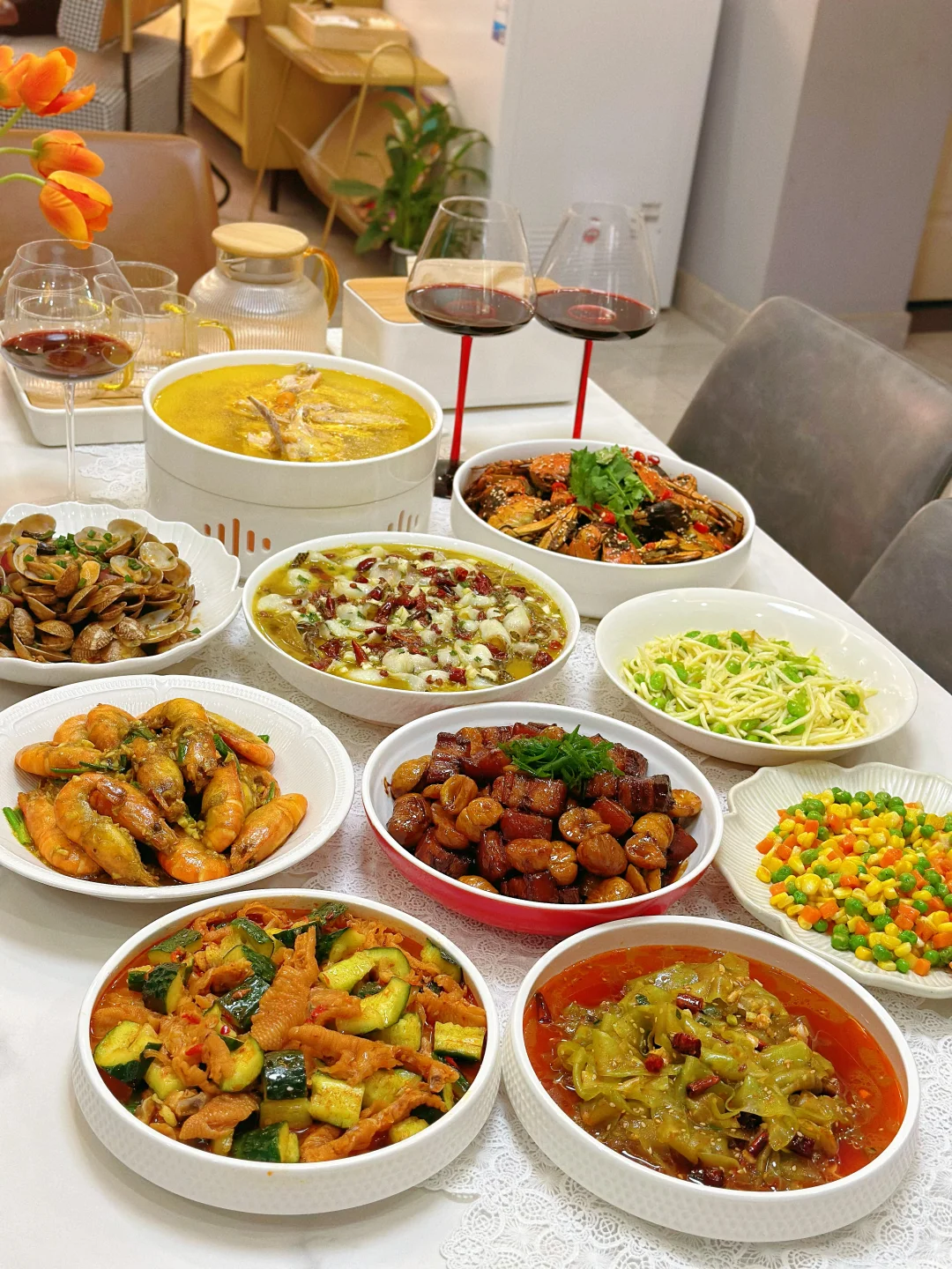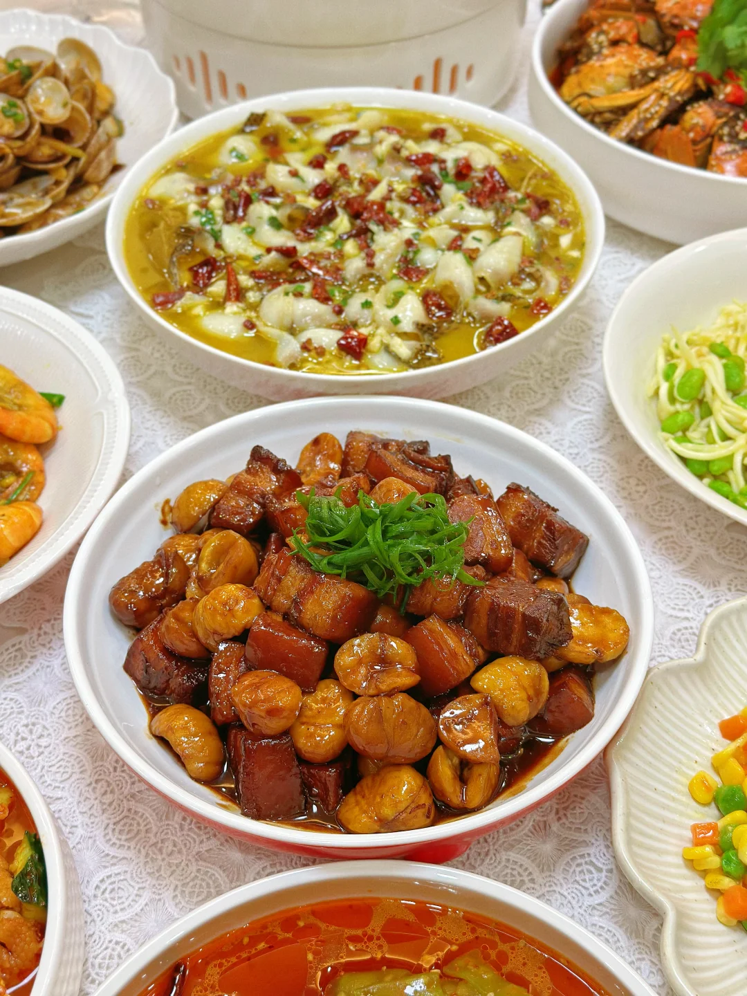 和朋友相约,宅家做一桌美食 小酌一杯,又是快乐的一天 家常菜菜单: 酸菜鱼片🐟 板栗红烧肉🥩 咖喱罗氏虾🦐 香辣蟹🦀 茭白炒毛豆 酱炒花甲 清炖鸡汤🐔 三色什锦 凉拌莴笋 柠檬鸡爪拌黄瓜