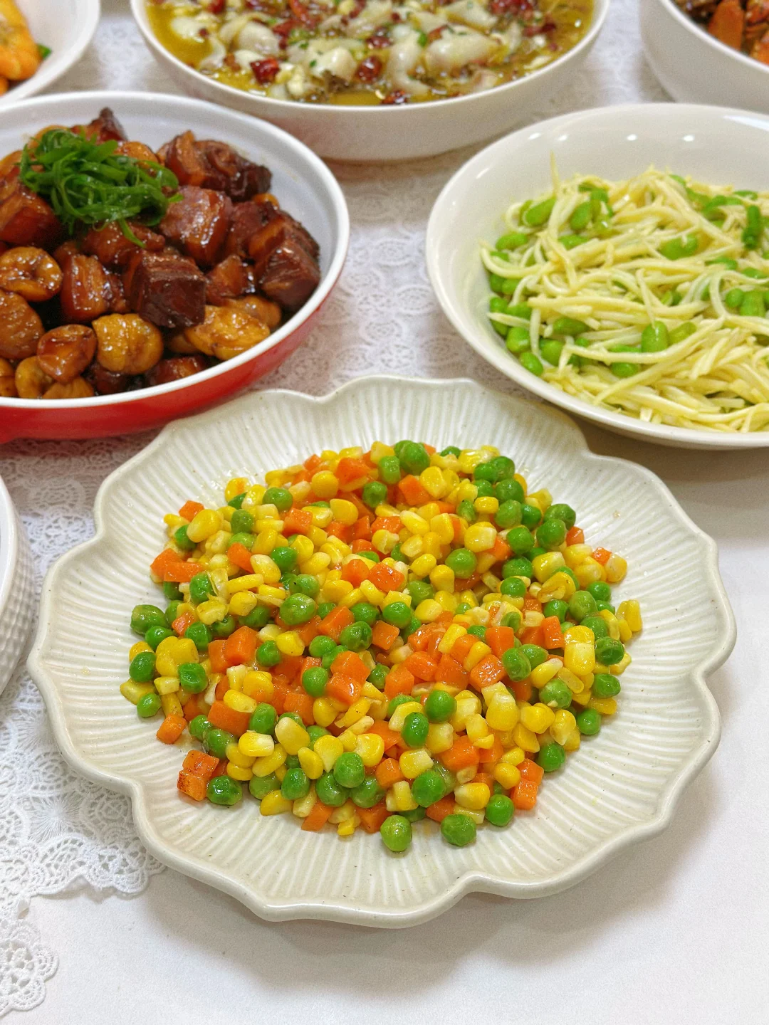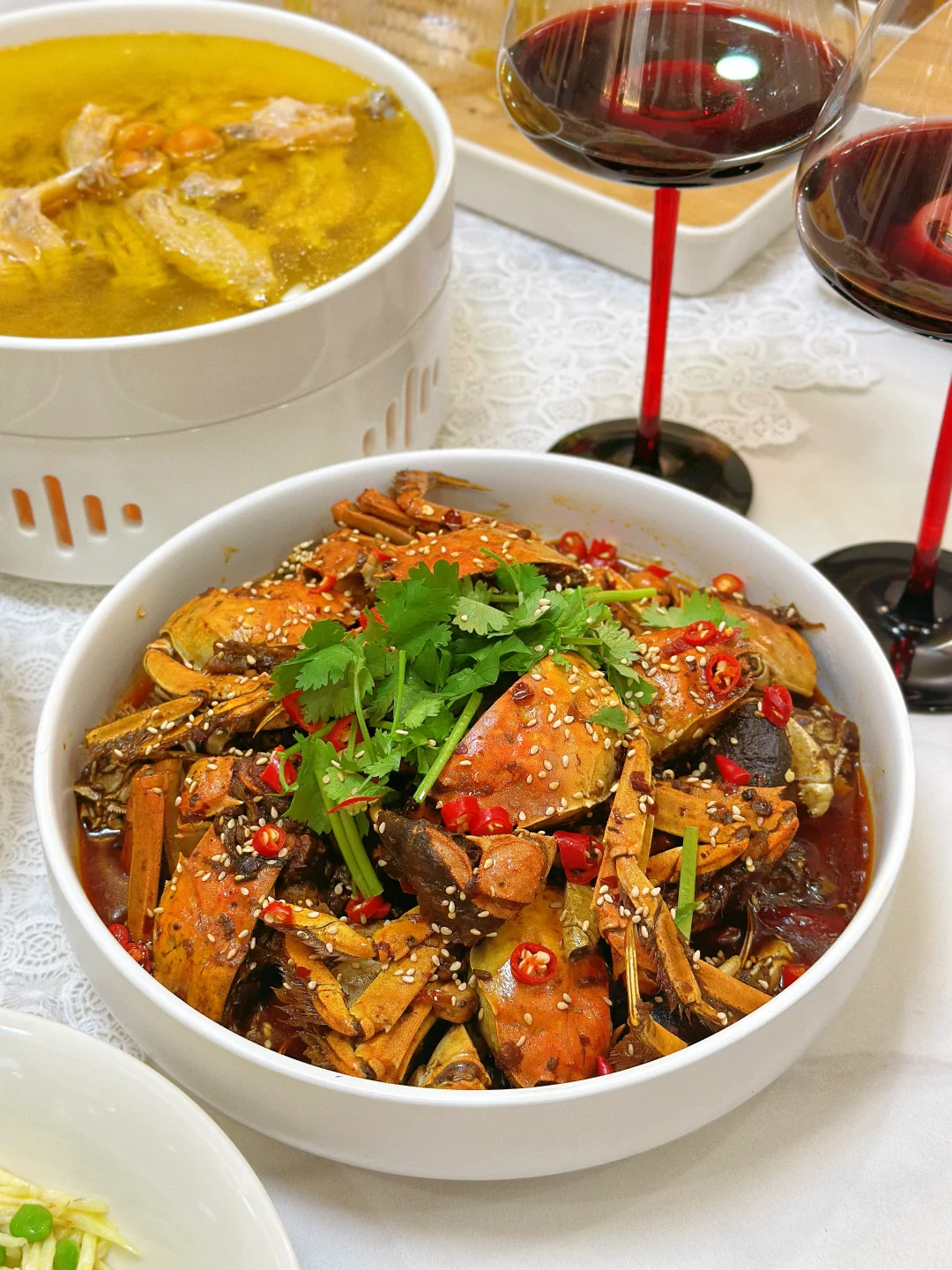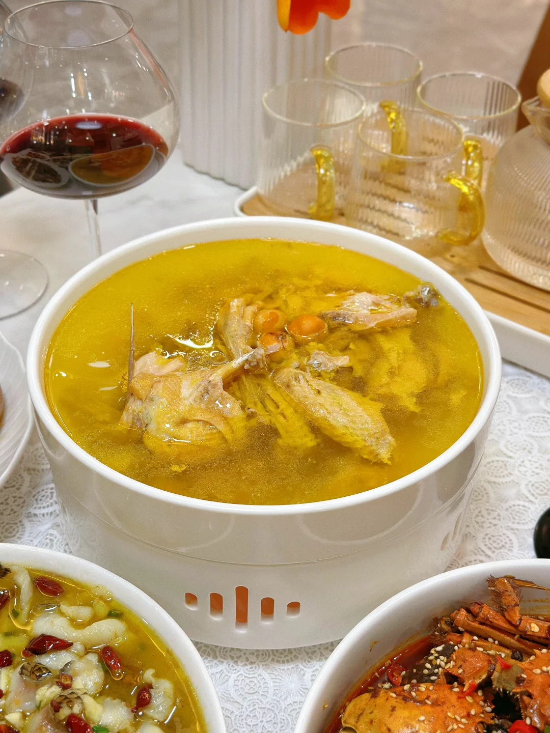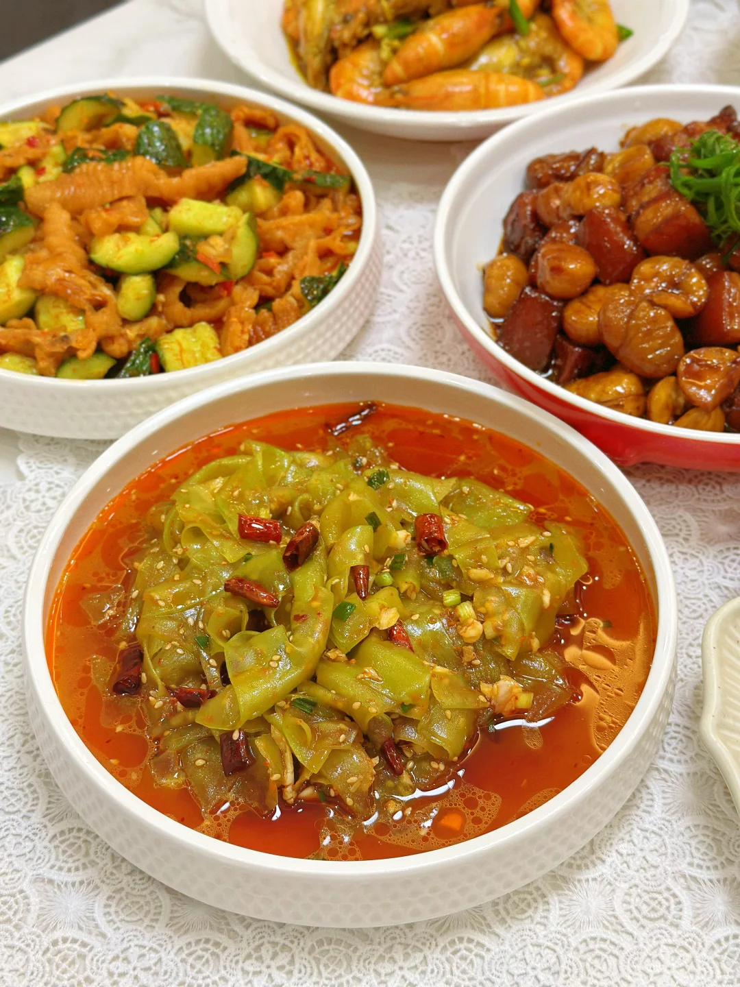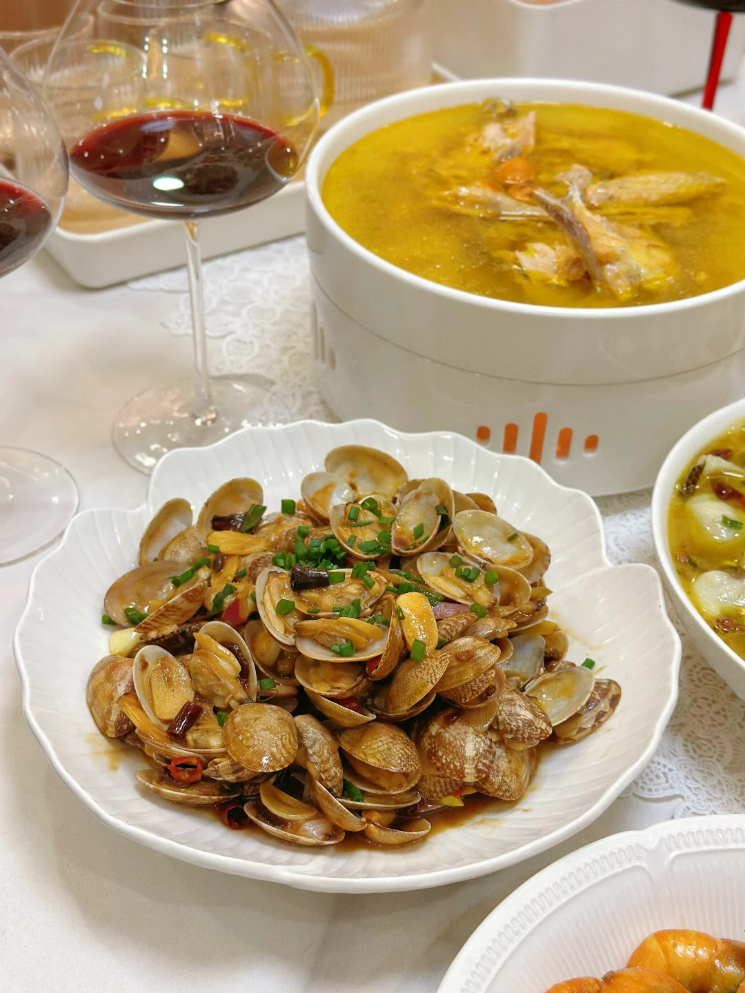 和朋友相约,宅家做一桌美食 小酌一杯,又是快乐的一天 家常菜菜单: 酸菜鱼片🐟 板栗红烧肉🥩 咖喱罗氏虾🦐 香辣蟹🦀 茭白炒毛豆 酱炒花甲 清炖鸡汤🐔 三色什锦 凉拌莴笋 柠檬鸡爪拌黄瓜