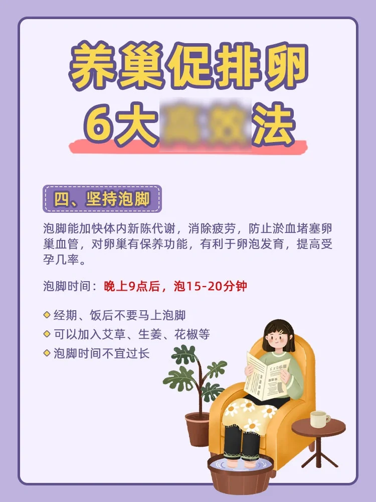 泡脚能加快体内新陈代谢,消除疲劳,防止淤血堵塞卵巢血管,对卵巢有保养功能,有利于卵泡发育,提高受孕几率。