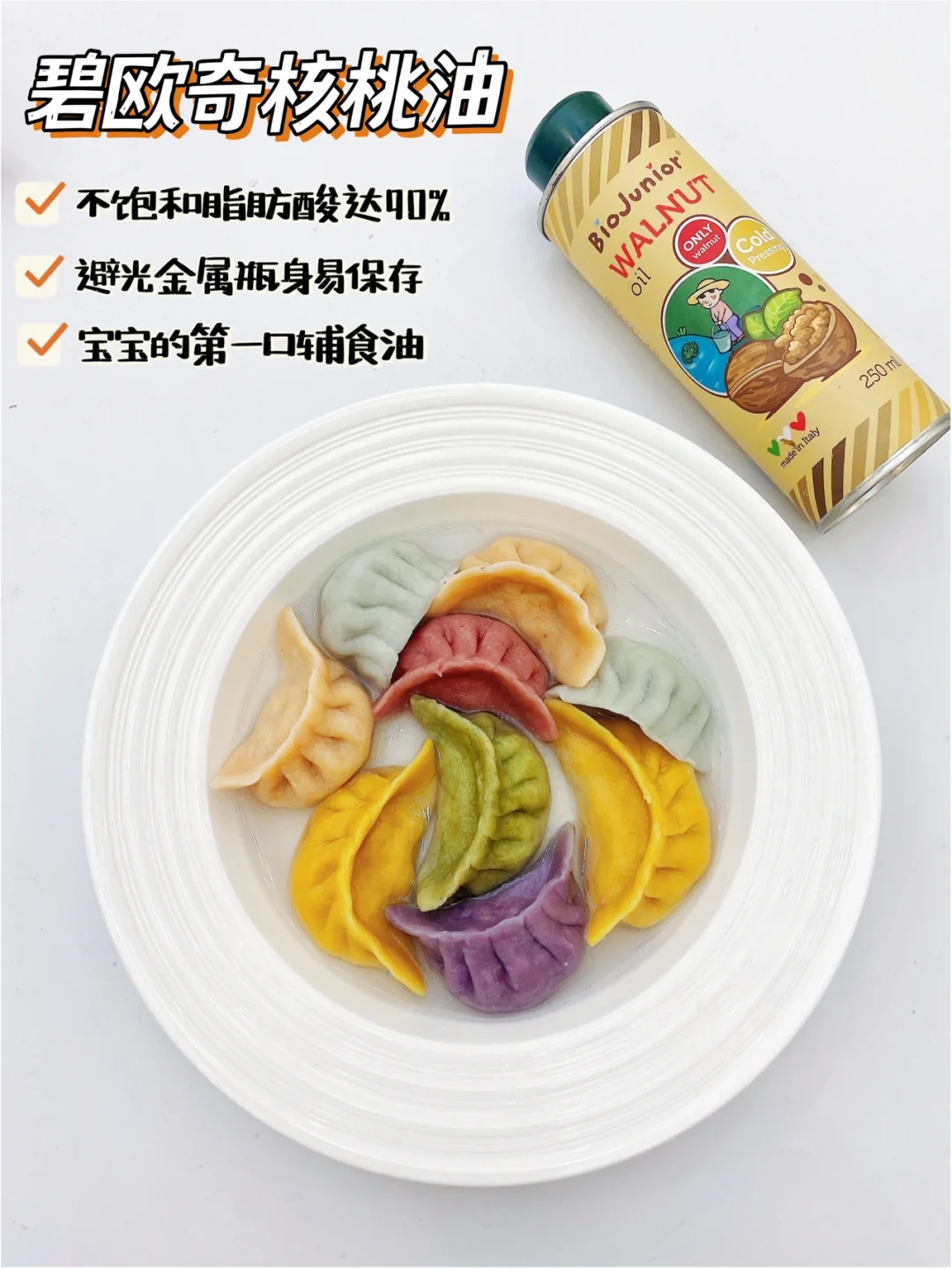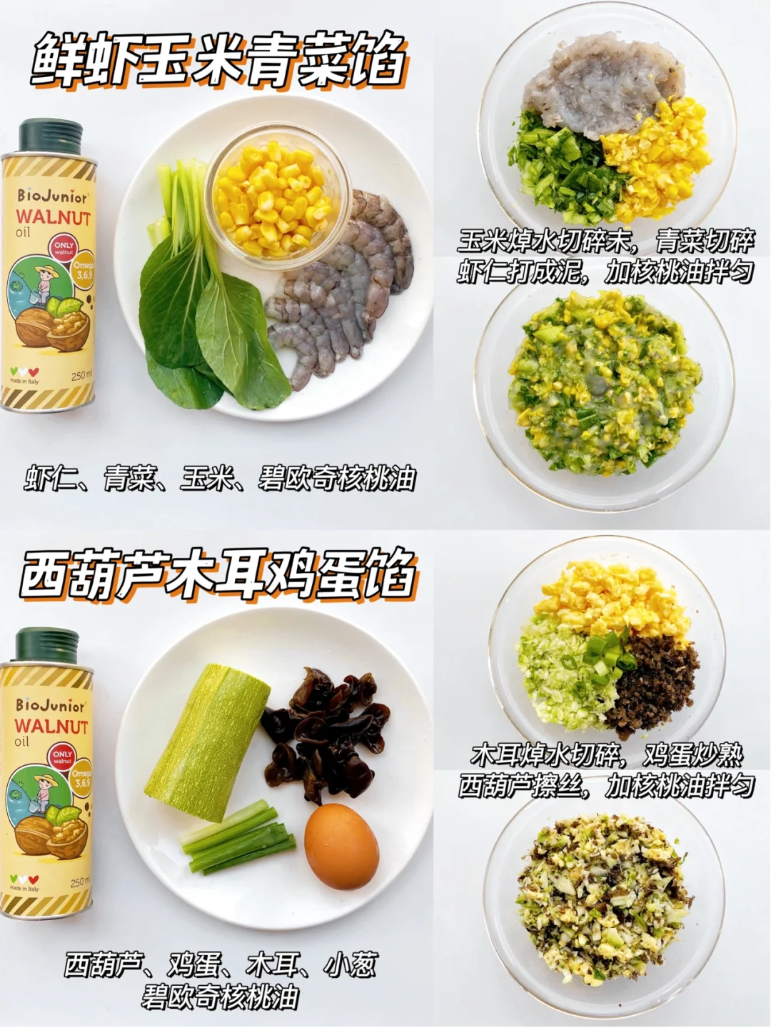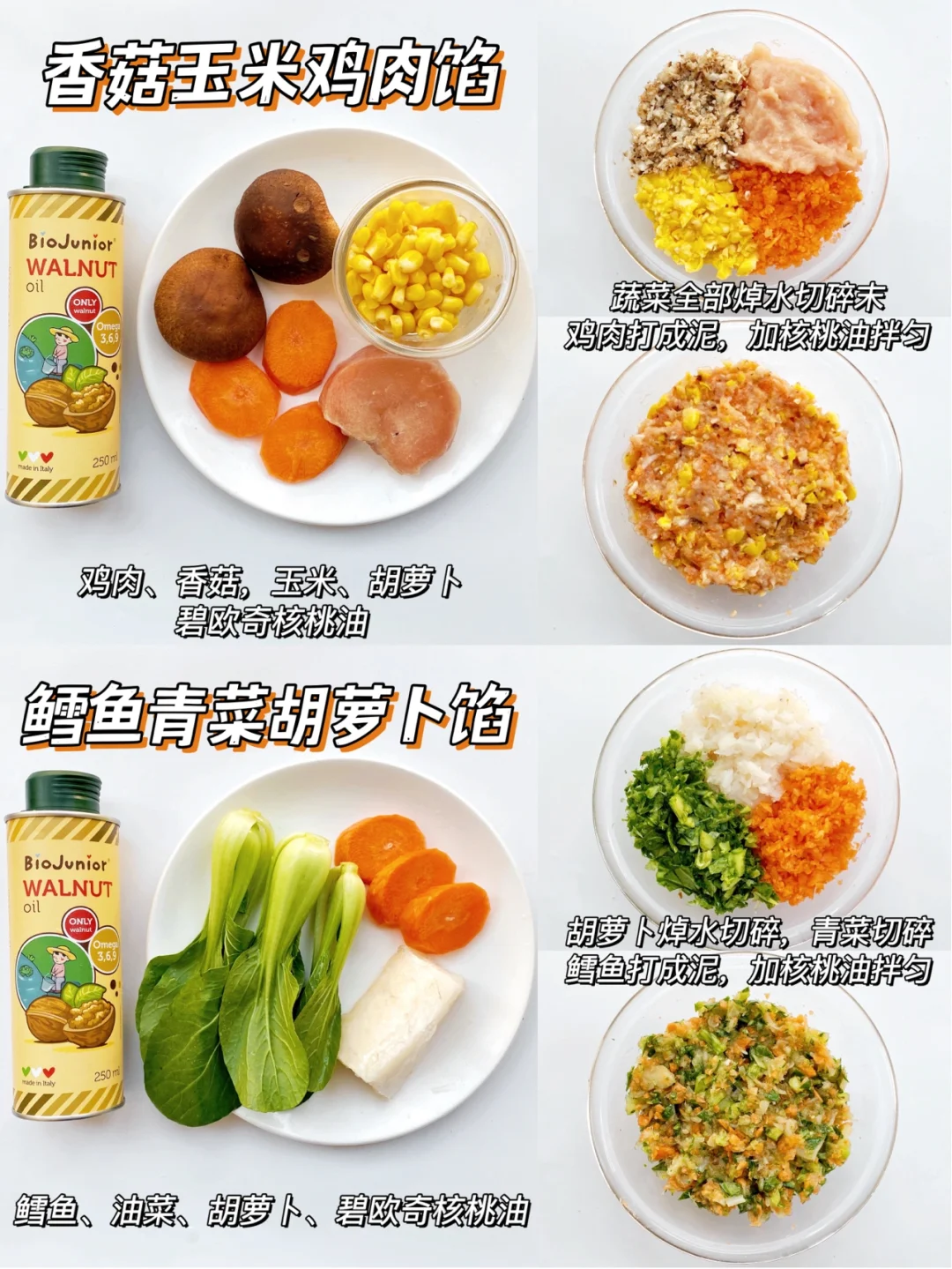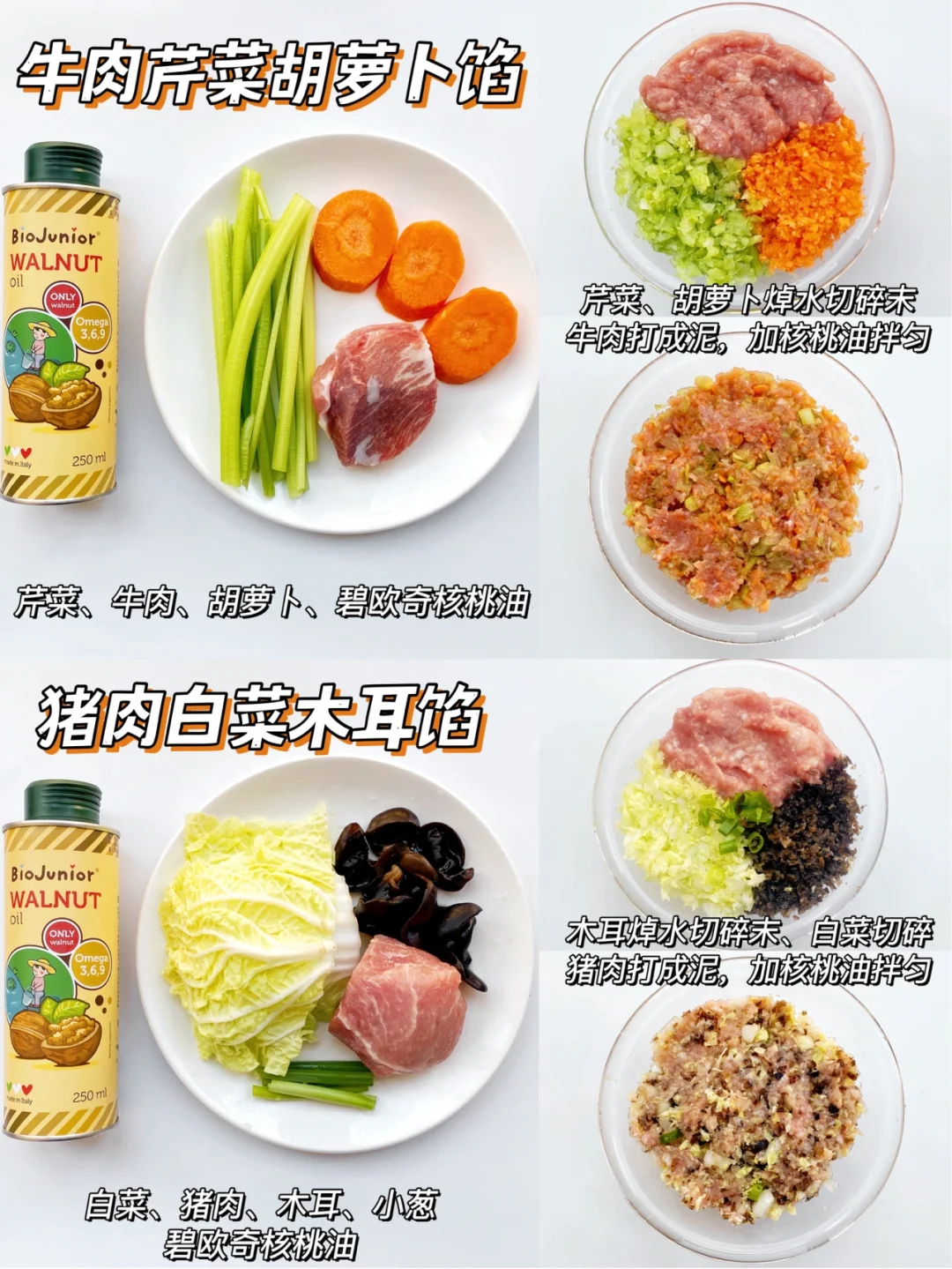 🌟每款馅料都是荤素搭配营养均衡,调馅的时候我都会加两滴碧欧奇核桃油。🤎这款核桃油是赞赞6个月就开始吃了,其中不饱和脂肪酸含量高达90%,直接添加再辅食里增加香味又补充营养。
