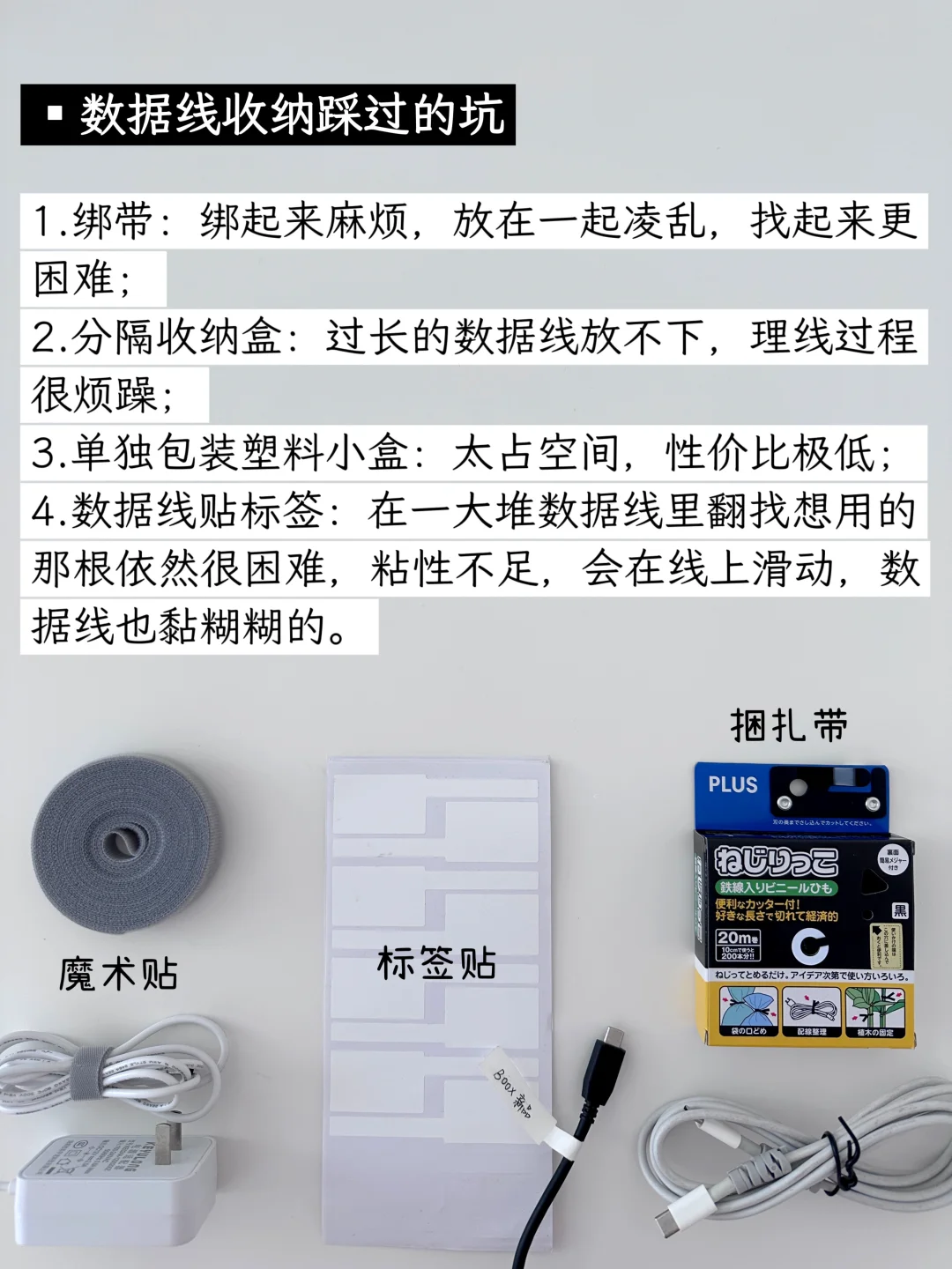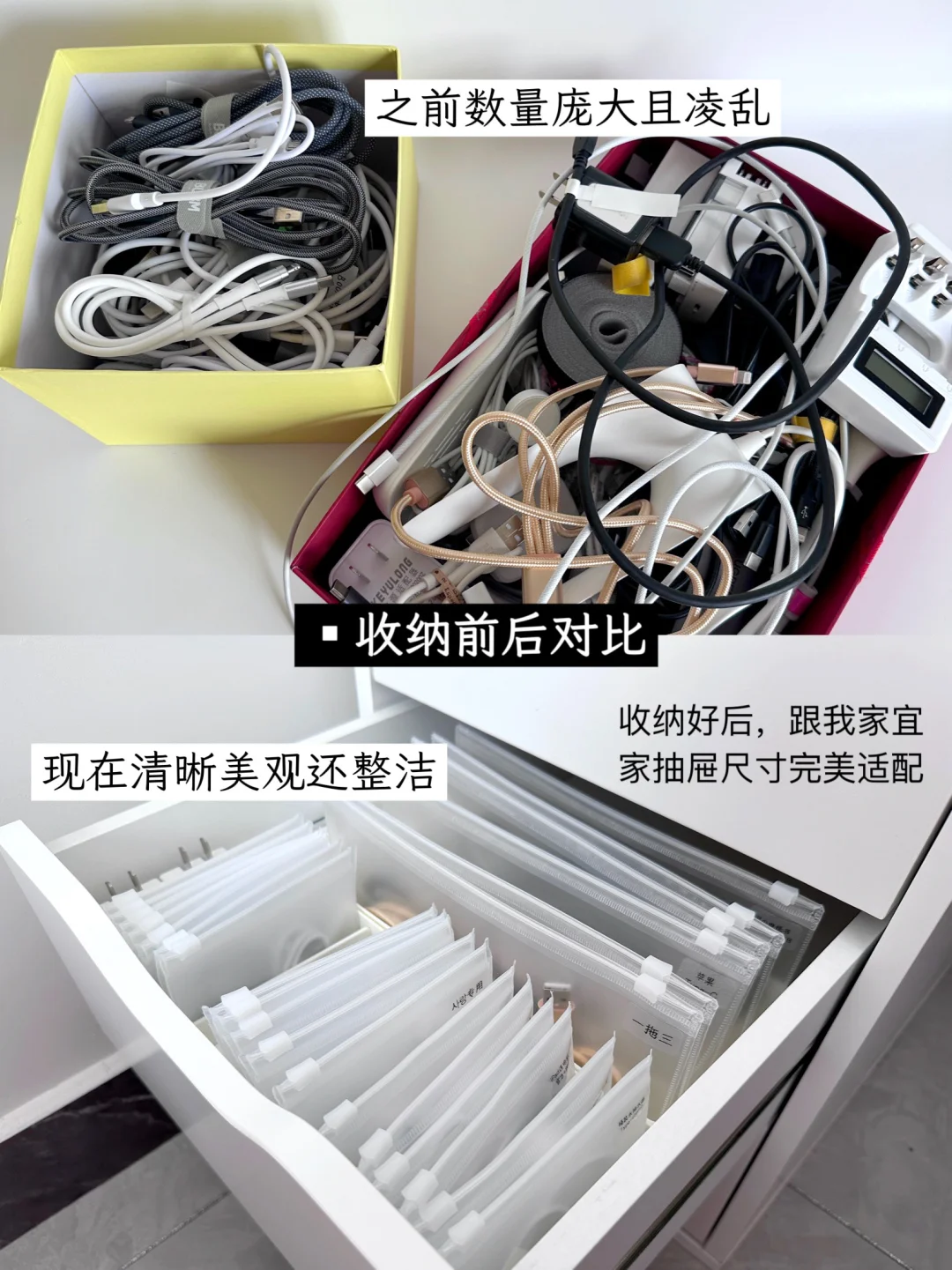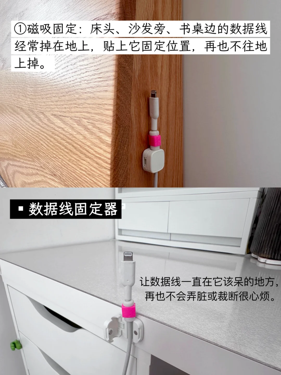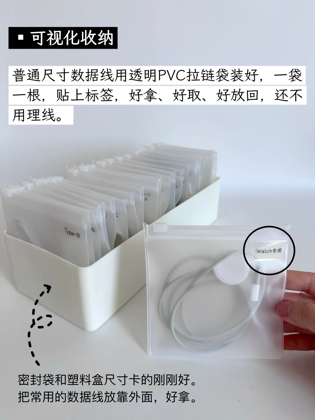 之前我家在书桌、床头、沙发边、餐桌旁的各种数据线总能缠成“盘丝洞”,书桌里全部数据线虽然用魔术贴扎带都一一缠绕整理过了,但是每次找数据线都要翻找好久。现在经过整理全屋数据线,终于找到了超适合的极简全屋数据线收纳方法,整个人都舒坦了哈哈~ 极简J人的全屋数据线收纳方案: [红色心形R]一.可视化收纳 精简收纳步骤才不容易复乱~ 普通尺寸数据线用透明PVC拉链袋装好,一袋一根,贴上标签,好拿、好取、好放回,还不用理线。收的时候无需捆扎整齐,用的时候也不用解捆。 这个收纳方式我用了一年,始终能保持整齐,告别缠绕乱象,很好收拾,而且维护起来很简单,大家可以直接抄作业。 [黄色心形R]二.两种插排收纳盒 1.原木极简:耐看、与家居风格相搭配、存在感低。 2.极简铁艺:简约、干净、实用的两款插排收纳盒。 每一面都可磁吸,极大提高了利用率。底部粘贴4个mini万向轮,滑动很丝滑,使用更方便咯!粘上带背胶的磁铁贴片,零散易找不到的小文具都可以临时贴在上面。 [绿色心形R]三.数据线固定器 [蓝色心形R]四.数据线防裂小巧思 拯救数据线开裂:生料带,缠绕在数据线两端,粘性好、低调耐看,性价比高,一卷能缠全家数据线~ [紫色心形R]五.数据线收纳踩过的坑 1.绑带:绑起来麻烦,放在一起凌乱,找起来更困难; 2.分隔收纳盒:过长的数据线放不下,理线过程很烦躁; 3.单独包装塑料小盒:太占空间,性价比极低; 4.数据线贴标签:在一大堆数据线里翻找想用的那根依然很困难,粘性不足,会在线上滑动,数据线也黏糊糊的。 我是小哈娜,分享简单生活和精致好物。 谢谢你的时间,下次见~ 极简生活 极简主义 极简 数据线 数据线收纳 我的收纳分享 收纳好物分享 生活小妙招 收纳小妙招 你家数据线收拾的整齐好拿取吗?