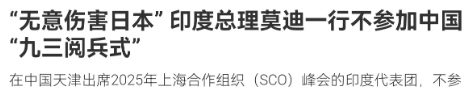 印度媒体出来解释了!来自印度媒体9月2日的消息说,印度总理莫迪在参加完上海合作组织的峰会之后,迅速回到了印度,并没有参加接下来举行的阅兵活动。这样的情况引起了西方媒体的关注。也引起了世界各国的猜测。 但是印度媒体强调,印度总理莫迪这样的做法,其实是为了防止从感情上伤害日本,所以选择了回国。 对于印度媒体的这种说法,我们看着还是非常意外的。毕竟我们举行正常阅兵活动,也是为了纪念抗战和二战的胜利,这是世界反法西斯的胜利。并不是单独属于哪个国家的。日本对当年犯下的错误应该负责,应该作出道歉,这是全世界公认的事实。 印度在这个时候表达了自己的想法,说是为了防止伤害日本。只是这种说法,确实让人觉得不可思议。难道我们搞这样的纪念活动值得怀疑? 所以,印度现在的立场还是有一些问题的。虽然加强和我们的合作,但是从根本上还是没有改变自己的心态。