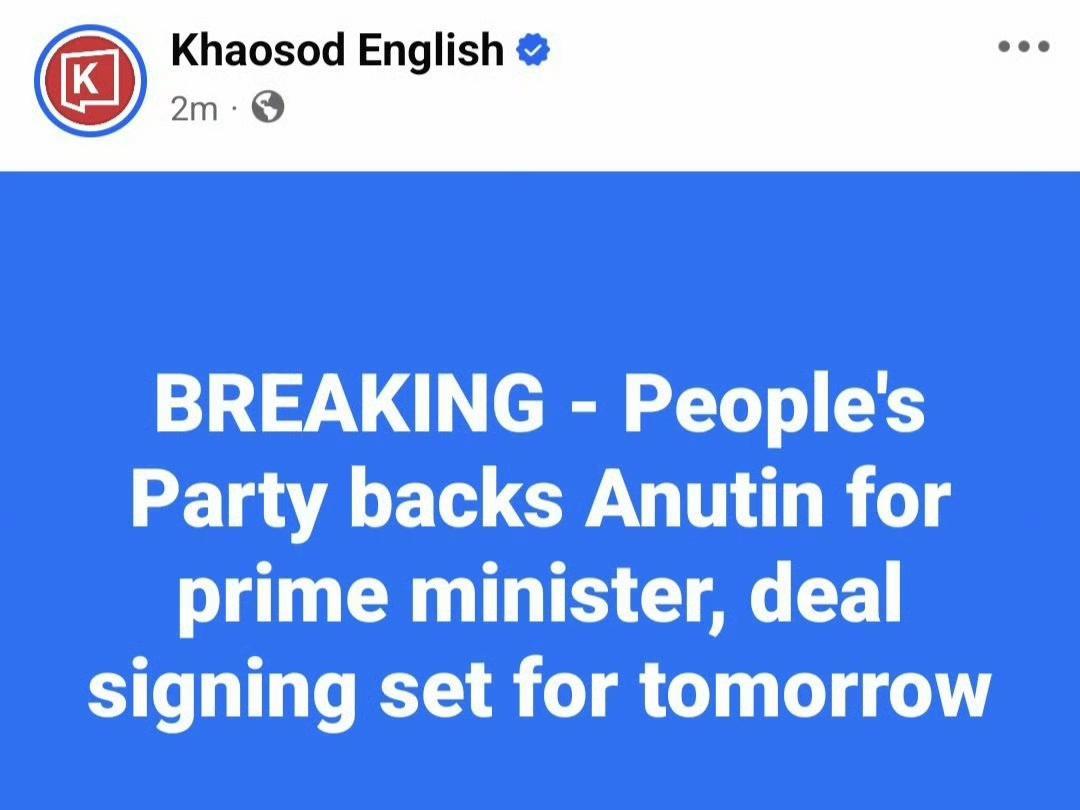 正义勇敢党塔玛纳给了为泰党政府最后致命一击,据报道,人民党已经最后决定支持自豪党阿努廷,现在自豪党阿努廷已经遥遥领先,可能要出任泰国第32届总理。接下来有军方的热闹了。 就是不知道泰国军方和泰国国王拉玛十世会不会批准自豪党阿努廷和人民党的联手组阁?