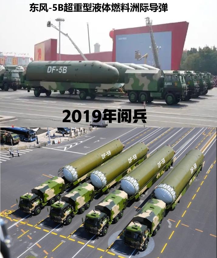 东风-5是一个庞大家族,上一次大阅兵即2019年阅兵中,展示上一个型号东风-5B导弹,每发被分成两部分,进行展示。而1984年阅兵中,东风-5基本型首次亮相,也是每发被分成3部分展示。