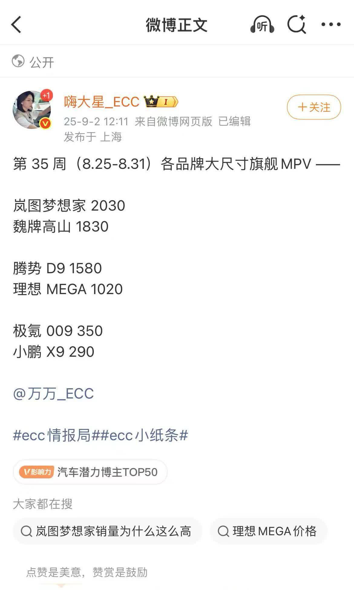 魏总天天马不停蹄的各处奔跑,还是有效果的 8月份长城汽车销量为115558辆,其中新能源汽车销量为37495辆,同比增长了50%以上。长城汽车的新能源销量主力应该是魏牌,坦克和欧拉了。哈弗品牌现在的猛龙,枭龙MAX也还不错,但是主要销量应该还是燃油车吧。 魏牌这次新高山7/8/9确实很成功,上周(2025.08.25-2025.08.31)魏牌高山销量为1830,等高山7上市之后,估计还能更高。。