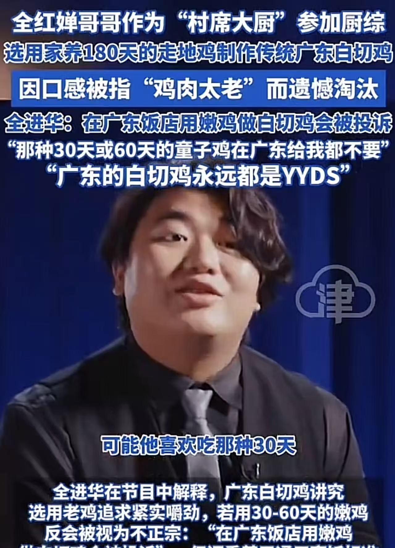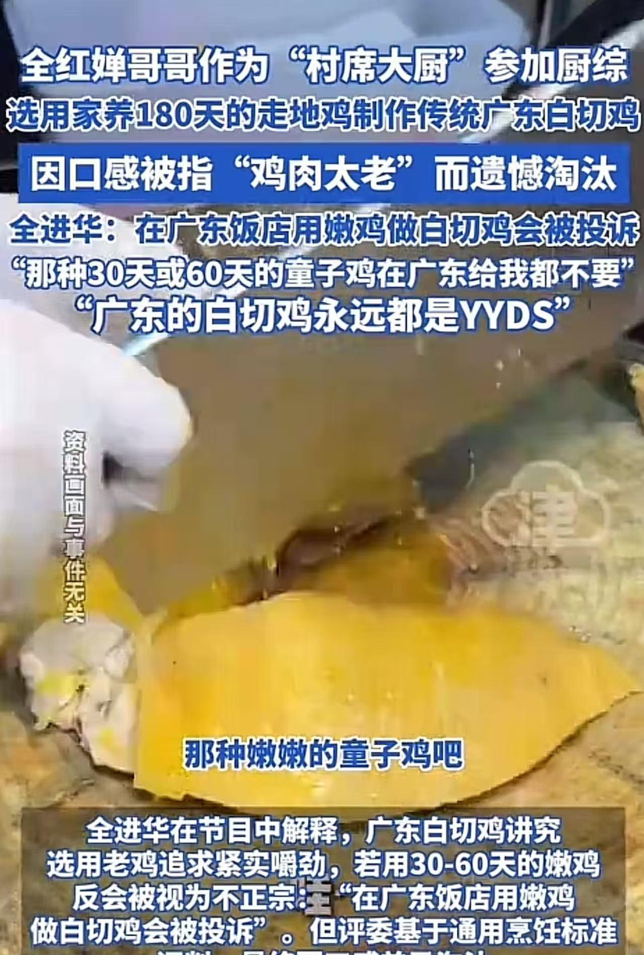 万万没想到!全红婵哥哥全进华,作为“村席大厨”参加厨综,结果做的白切鸡因为肉质太老惨遭淘汰!全进华不服气,指责评委不专业,还说自己的做法才是正宗的,广东白切鸡永远都是YYDS!”此话一出,获得广东网友猛赞! (来源:津云) 全进华以“村席大厨”的身份参加节目,他怀揣着对家乡美食的热爱与执着,精心挑选了自家果园里散养了整整180天的走地鸡,打算用它来制作一道地地道道的传统广东白切鸡。 从处理鸡肉到煮制,全进华每一步都严格按照传统的方法来操作。他满心期待着评委们品尝后能露出满意的笑容,给予高度的评价。 然而,当评委们品尝完这道白切鸡后,却给出了不太理想的反馈。他们认为鸡肉的口感偏老,不够滑嫩,与他们心中预期的标准有着不小的差距。 这个结果就像一盆冷水,瞬间浇灭了全进华心中的热情。最终,全进华遭遇淘汰! 赛后,他接受采访时说:“我承认,用180天的走地鸡做出来的白切鸡,确实没有那种滑嫩且水分很足的感觉。可能评委们更喜欢吃那种30天或者60天嫩嫩的童子鸡吧,但那种鸡给我,我都不要!” 他的语气坚定而自信,接着又解释道:“广东白切鸡就得养足天数,这样才能保证皮脆肉紧的独特口感。要是用30 - 60天的嫩鸡来做,反而会被视为不正宗!在广东的饭店里,如果用嫩鸡做白切鸡,肯定会被顾客投诉的!广东白切鸡永远都是YYDS(永远的神)!那些不懂吃的人,也就只能吃30天或者60天的鸡了!” 此话一出,瞬间引发热议,有网友说,我不是广东人,虽然在广东已经接近20年,我还是喜欢吃嫩鸡!所谓老鸡不论是营养口感还是色香味的任何一项都不比嫩鸡有优势!比赛就是以官方要求为准,不是以个人喜好为准! 也有网友说,真正两广的,都知道太嫩的鸡,根本做不了白切鸡,我奶奶没剩几颗牙都不吃!评委要的是“嫩口感”,全师傅守的是“湛江魂”,输赢不重要,守住这份本味,就赢了同乡的心。 还有网友说,30天的鸡那是饲料速成鸡,送给我都不要!全进华这话说到广东人心里了!180天走地鸡白切鸡虽没30天的嫩,但守住了广式味道的根啊!比赛输了又咋样,有同乡撑着,这份坚持比输赢珍贵多了! 在我看来,全进华这份对家乡味道的坚守和执着,远比比赛的输赢更加令人敬佩。很多人为了赢得比赛,会迎合评委的口味。但全进华没有,他虽然在这场比赛中输了,但他却像一位守护者,牢牢地守住了广东白切鸡的灵魂。 另外,我觉得让北方人来评论广东白切鸡,这本身就是一种错误的安排。白切鸡这道美食,可是广东、广西、海南这三个省份人们的心头好,它承载着这三个地区独特的饮食文化和历史记忆。 每个地方的美食都有其特定的地域背景和受众群体,就像不同风格的音乐,不能简单地用一种标准去评判。用北方的口味标准来衡量广东白切鸡,就好比用西方的审美去评判东方的水墨画,难免会出现偏差。 美食文化的传承不应被一场比赛的胜负所左右,更不该被地域的偏见所禁锢。唯有尊重差异、包容多元,美食的百花园才能绽放出更加绚烂的光彩!