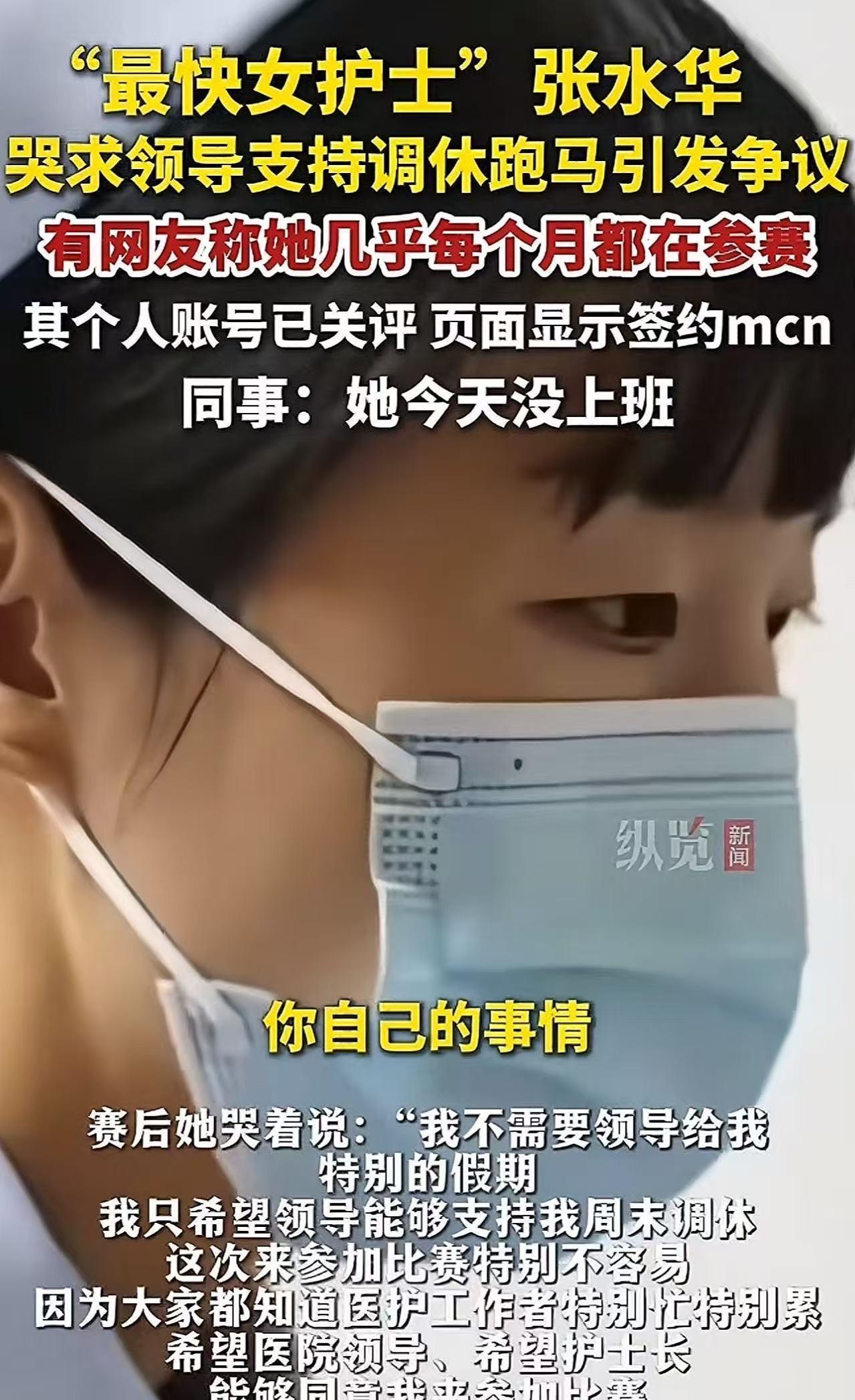 网友真的是越来越清醒了!张水华得了冠军后,本想让舆论道德绑架领导给自己周末调休,但万万没想到,网友却批评她自私自利!网友:荣誉是我的,奖金是我的,锅是领导的,活是同事的! 张水华这次捅了马蜂窝,原因很简单,她跑马拉松不是单纯的爱好,实际上是赚钱。 比赛的奖金和荣誉拿了,签约机构mcn整上了,361品牌方也签约了,每年都有代言费可以拿。 她混得风生水起名利双收,是同科室的同事在周末牺牲个人时间和她调班换来的。 现在同事不和她调班了,她引导舆论给领导上压力,必须整个科室围绕着她转,这是多自私! 看她自己账号发的视频,一年要参加20场以上的马拉松。 所以大家都懂了吧?一年52个周末,她差不多有一半的时间,都要出去兼职上班挣外快,还要科室的同事配合她,不配合,她就公开喊话领导支持她! 同事也是护士,他们也想周末放假,陪陪孩子。她一直要求领导周末给她调休,这就意味着其他同事要给她代班。 对医院24小时轮值的单位,支持你周未调休跟给你特殊假期有什么区别? 说得好像周未大家都愿意调成上班一样!周未是大多数人休假的时间,对于有家庭的人来说,你一到五给我的是休整,周未的才叫假期! 如果她是为科室争光,我相信领导和同事肯定没意见,关键是荣誉和奖金是她自己的,麻烦却是领导和同事的,那搁谁都不愿意。不能次次因为你打乱别人休假的计划。 做为一个护士,肯定要先以本职工作为主,平时大量的训练,真的能保证她上班时的状态么, 每次上夜班前,都在训练跑步,那她夜班还怎么上!不会打瞌睡吗? 有个网友说的好:嘴上说是爱好,心里就是想搞钱!一百个马拉松冠军,也不如一个尽职尽责的护士! 三甲医院的高工资她要,还要同事全都为她牺牲生活,也不肯辞职,因为她老公有一个体育俱乐部,有一个医护健康跑项目,如果辞职就没有中国最快护士的光环了,没光环了品牌方就不签约她了,还有比赛的奖金!