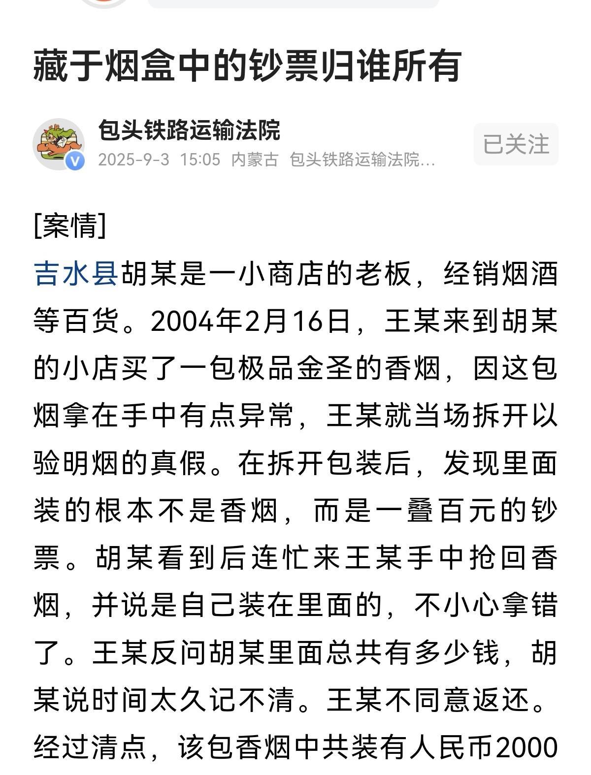 江西吉安,男子去小卖店买了包22元一盒的香烟,往外走时,感觉手里这盒烟感觉不对,便停下脚当场拆封,看看是不是假烟。结果他愣在原地,烟盒里竟有一沓钱。店主赶紧说是自己的伸手要抢,男子让他说出钱数,店主说时间长忘了多少了。男子表示,既然说不清楚,那这2000元就不是你的,自己花钱买的就是自己的。店主说啥也不干,一纸诉状把男子告上法庭,要求归还1978元。最后法院判决让他们意想不到! 2004年2月16日,王某推门走进胡某开的小烟酒百货店。他是这家店的常客,生活日用品基本上都是来他家店里购买。 胡某每天经营着小店,日子过得平淡而规矩,靠着邻里间的熟络生意维持生计。 胡某看王某进店,热情招呼,并询问要买啥?王某指着他常吸的那牌子的烟说就来盒烟。 胡某麻利地递给他,王某如往常一样,直接付了22元钱,拿起烟往外走,可突然他感觉手里的烟有些不对,便停下了脚步。 常年买烟的经验让他心里犯了嘀咕:这烟怎么有点不对劲? 他随口说了声:这烟有点不对劲,你不会卖给我假烟吧?胡某赶紧回应,说不可能。 王某想验明真假,当场拆封,可当烟盒被打开的瞬间,他愣住了,里面根本不是烟,而是一沓百元钞票。 王某目瞪口呆,怎么买盒烟还中奖了,嘎嘎新的百元大钞太让他惊喜了。 老板一看,蹭地从柜台后绕出来,伸手就去抢王某手里烟盒,并辩解说这是他的钱! 王某下意识地往后退了一步,瞪着眼问胡某,你抢什么,哪张钱是你的?那你说说里面是多少钱?你的钱有记号吗? 胡某挠着头支吾了半天,说时间太久了记不清了。反正就是自己的。 王某说,是你放的,你会不知道多少钱吗?你说不出准确的数,那就不是你的!我买的烟就是我的,是我中奖了! 王某抽出所有的钱,细细清点,烟盒里竟然有2000元钱。 胡某急得眼睛直冒火,说是自己拿错了,那明明就是自己的钱。并说自己卖的是烟不是钱,让王某除去烟钱退还1978元。 可王某认为,自己花钱买的,这烟盒里面的东西就该归自己。 为这2000元钱,双方各执一词,争执不下,胡某无奈,气愤地将王某告上法庭,要求其返还1978元。 《民事诉讼法》第67条第1款规定:当事人对自己提出的主张,有责任提供证据。 当事人若要支持自己的诉讼请求或反驳对方的主张,需提供相应证据加以证明。 胡某主张 2000 元是自己的,就要拿出有效证据来证明,比如说钱是多少钱,或钱上有什么记号等。 他连烟盒里装的是多少钱都不知道,也没有其他证据证明钱是他的,需承担举证不能的不利后果。 《民法典》第465条规定:依法成立的合同,受法律保护。依法成立的合同,仅对当事人具有法律约束力,但是法律另有规定的除外。 《民法典》第224条规定:动产物权的设立和转让,自交付时发生效力,但是法律另有规定的除外。 王某认为,自己买了香烟,支付了22元钱,与胡某之间的买卖形成合同关系,合同在双方达成合意时成立并生效。 那么,香烟未卖时是胡某的,王某付款后,香烟的所有权就转换成了王某,所以他认为烟盒里的钱就是他的。 《民法典》第151条规定:一方利用对方处于危困状态、缺乏判断能力等情形,致使民事法律行为成立时显失公平的,受损害方有权请求人民法院或者仲裁机构予以撤销。 显失公平要求一方利用对方不利情形,使双方权利义务明显不对等。 法院审理中有不同意见:胡某卖烟合同成立,香烟所有权发生转移,但只是香烟所有权发生转移,且22元购买2000元,属于显失公平,属于可撤销的合同。故钞票应归胡某所有。 王某买烟合同成立,取得了这包香烟的所有权。这2000元钱是在这包香烟中发现的,因此这2000元钱的所有权也随香烟所有权的转移而转移为王某所有。 经法官分析认为,胡某与王某都拿不出证据证明2000元钱是他们的,那这笔钱应以所有人不明的隐藏物处理。 《民法典》第319条规定:拾得漂流物、发现埋藏物或者隐藏物的,参照适用拾得遗失物的有关规定。法律另有规定的,依照其规定 。 《民法通则》第79条规定:所有人不明的埋藏物、隐藏物,归国家所有。 烟盒里 2000 元钱经过精心折叠后放进香烟盒,香烟盒又精心包装恢复外在面目,不易被发现,符合隐藏物特征。 原、被告双方都不能举证证实这2000元是自己的,可认定为所有人不明的隐藏物。 根据法律规定,所有人不明的隐藏物归国家所有,所以这2000元应归国家所有。 胡某与王某争抢了半天,最后谁都没落到一分钱,这笔钱被没收归公了! 有人说:两人都别贪,商量着一家分一半,不挺好的,这下可好,谁都没落着。 有人说:买烟人要是出了门或是回到家再打开烟盒,那钱就是他自己的了! 还有人说:两个小丑不知螳螂捕蝉,空欢喜一场! 对此您怎么看? #秋日生活打卡季#