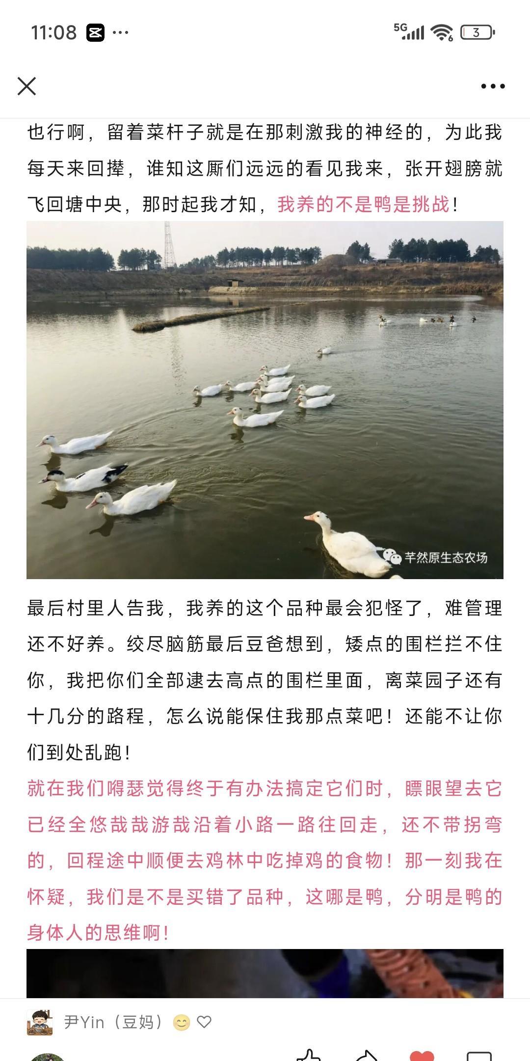 连续养了有3年的鸭子。本来还满怀信心,想着以后每年都养些鸭子,甚至还计划能不能扩大规模,可昨天我劝老公放弃吧。 第一次学养殖时,我们有养过鸭子,那时候养的品种还挺多。 我们老家有一种鸭子叫混水。(估摸着是这个字。) 它是白色的羽毛,体形有些像老雉,但是不是老雉,因为它的头部没有红色的肉瘤。 可能是混水鸭比较好养,不似老雉小时候那么娇气,当地人很喜欢养。我也就跟风,让老公养了一批…… 那一次,养的有些吃力。因为刚开始学养殖,也没养过鸭子,哪知混水鸭又极其不安分,喜欢飞。 养了一次后便再也没养。 后来又想尝试其他的鸭子,白鸭、番鸭…麻鸭…我们都试着养过,中间也因为各种原因只养了一次就不再养。 更多的原因是鸭子难拔毛,而我们又纯粹的采用几乎喂养的模式,刚开始做养殖,又深知鸭子能吃,老公喂粮食时总是抠抠搜搜的,导致鸭子大小不一…… 大概是三年前,我们养殖慢慢进入轨道。 我俩又想养鸭子。可能人都是贪心的,有了鸡有了鹅,自然就想着要是再有鸭子吃岂不是家禽肉就全了。 老公善于挑战,敢于尝试。就真的买了几百只麻鸭回来,反正农场有面积,也有水。 那年鸭子的好评率很高,有些食客说吃了念念不忘。 这才促成我们每年都要养鸭子的想法。但是,也不敢养多,只养两三百只。 老公说,我们的水面只能养这么多,多了脏水。 今年,本来还是一如既往的养鸭子。可是昨天,我却劝他,放弃养鸭吧,以后别养了。他若有所思,沉默好一会儿说,这鸭子是不能养。 今年高温时间很长,几次雷暴也没下多少雨。池塘的水眼见着变少,而且越来越混。 经常看到有鱼漂浮着…… 我们知道是鸭子干的。鸭子跟鹅不同,鹅是戏水,鸭子是翻塘,它们喜欢把头钻进水底,在使劲的啄河底的淤泥,如果塘水深,啄不到底,它们就啄塘梗边。 几乎鸭子待的池塘,周边都是坑洞。 每每看到它们把池塘的水搅得混浊时,我们都皱着眉头。 可又没办法,养了它们就只能任由它们霍霍。 起初,老公说要不年底时给两口池塘翻新,把塘挖深一些,这样即可以多蓄水,深一点,养鸭子就更好。 直到前几日,他又发现一个问题,鸭子喜欢钻到猪的场地休息,而其中一处猪群竟然吃鸭子,这让他很吃惊。 明明养了几年猪,也没见过这事,如今猪竟然反形了? 众多事情发生,让我们陷入犹豫,鸭子要不要养。 这几年我们养过的牲畜很多,可一旦发现某种牲畜在喂养中麻烦很多,便可能淘汰。 我知道老公此时很犹豫,因为这几年他养鸭子总体来说还是很顺利,他常说鸭子比鸡鹅都好养,很小一点直接放到水里就可以,几乎不用精心照看。 反倒是鹅和鸡,小时候都要被人精心呵护着,尤其是鹅,特别娇气。 所以他很喜欢养鸭子省事。但又不得不面对,鸭子对水源的破坏比任何动物都要严重。 我也想到鸭子拔毛也不是一件轻松事。 想到这我跟他说不要养鸭子了,我们养肯定是放开养,它们到处跑,跑到猪里面,被猪吃了也不划算。 何况它们还脏水,跟鸭子比,猪肯定最重要,取舍还是不养鸭子为好。 没想到他点头了,说:是的,鸭子卖完就不养了,年底把池塘再翻一翻……那到时候要卖鱼,你可行? 我自信满满地回答他,放心吧,鱼交给我。