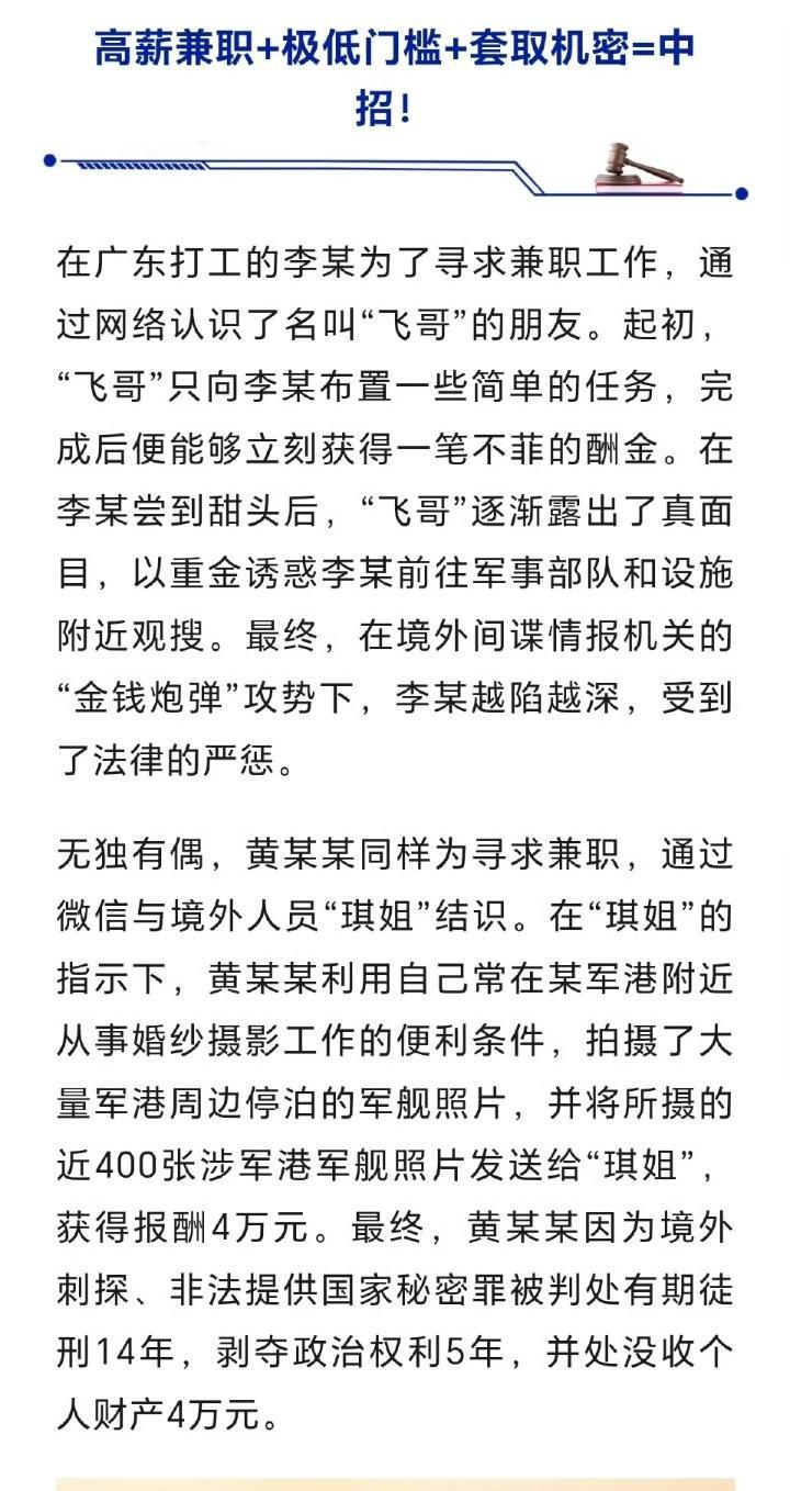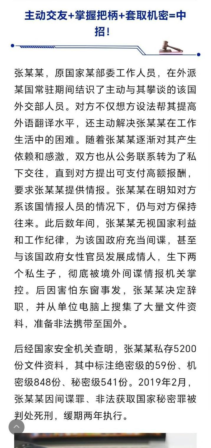 国家安全部再次发布三起间谍窃密案件!“甜蜜爱情”“亲朋挚友”“求职招聘”各个都是陷阱! 消息来源:国家安全部 9月4日国家安全部在其官方账号“安平”发布三起间谍窃密案件! 三起案件分别从:甜蜜爱情、亲朋挚友、求职招聘三方面解读了间谍的“诈骗”陷阱! 甜蜜爱情:间谍故意主动接近,制造一见钟情的假象,再利用情感控制,最终达到套取机密目的! 亲朋挚友:主动与我方人员交友获取信任,掌握把柄后,被间谍利用控制! 求职招聘:假借高薪兼职,低门槛的方式引诱其进入圈套,为其非法获取机密! 从三起案件可以看出境外间谍人员为了获取机密,简直无所不用其极,将目标人员一步步拉入陷阱! 我们广大普通群众也应该擦亮双眼,看清不切实际的诱惑,如遇可疑人员应当立马举报!