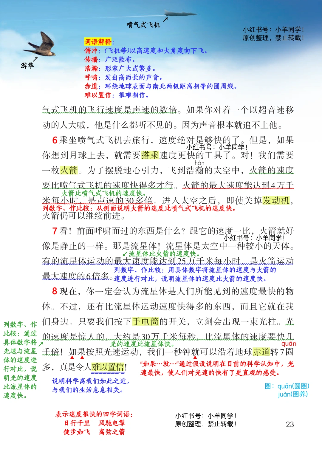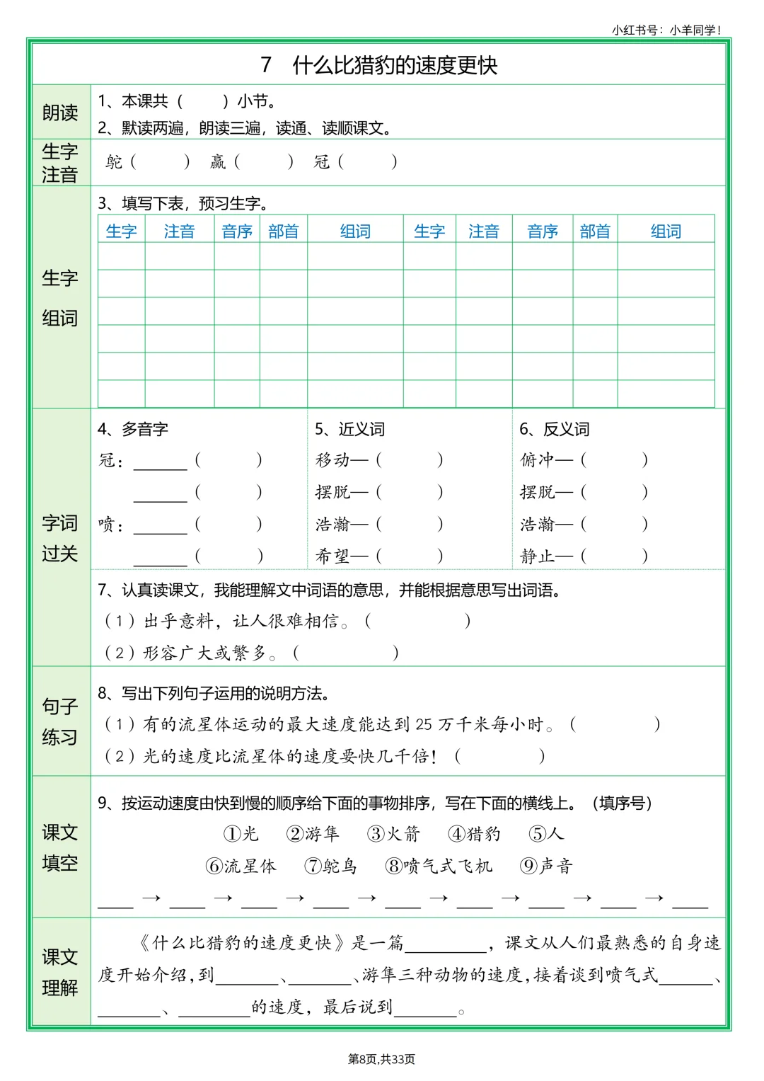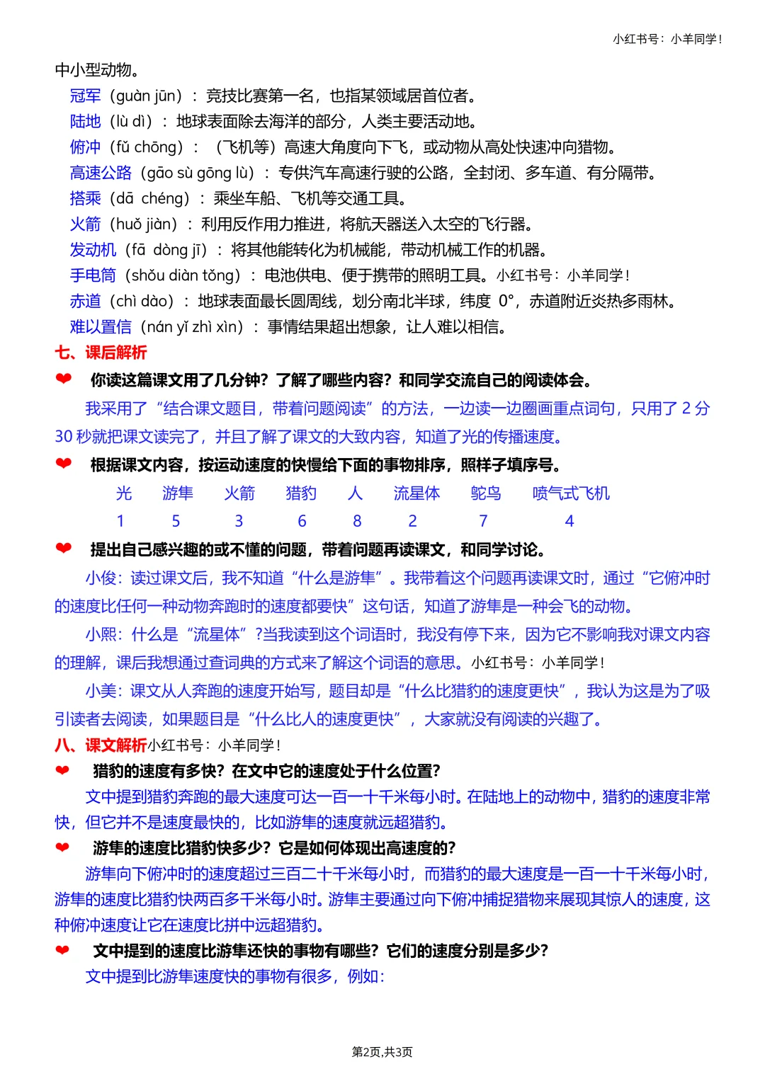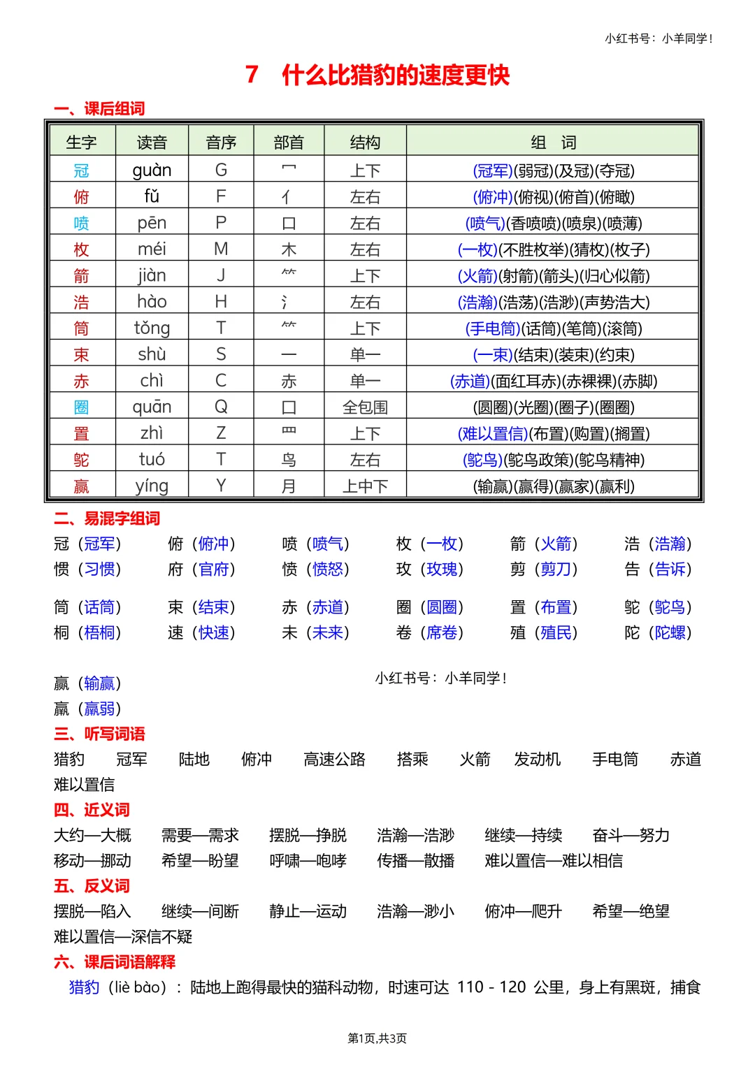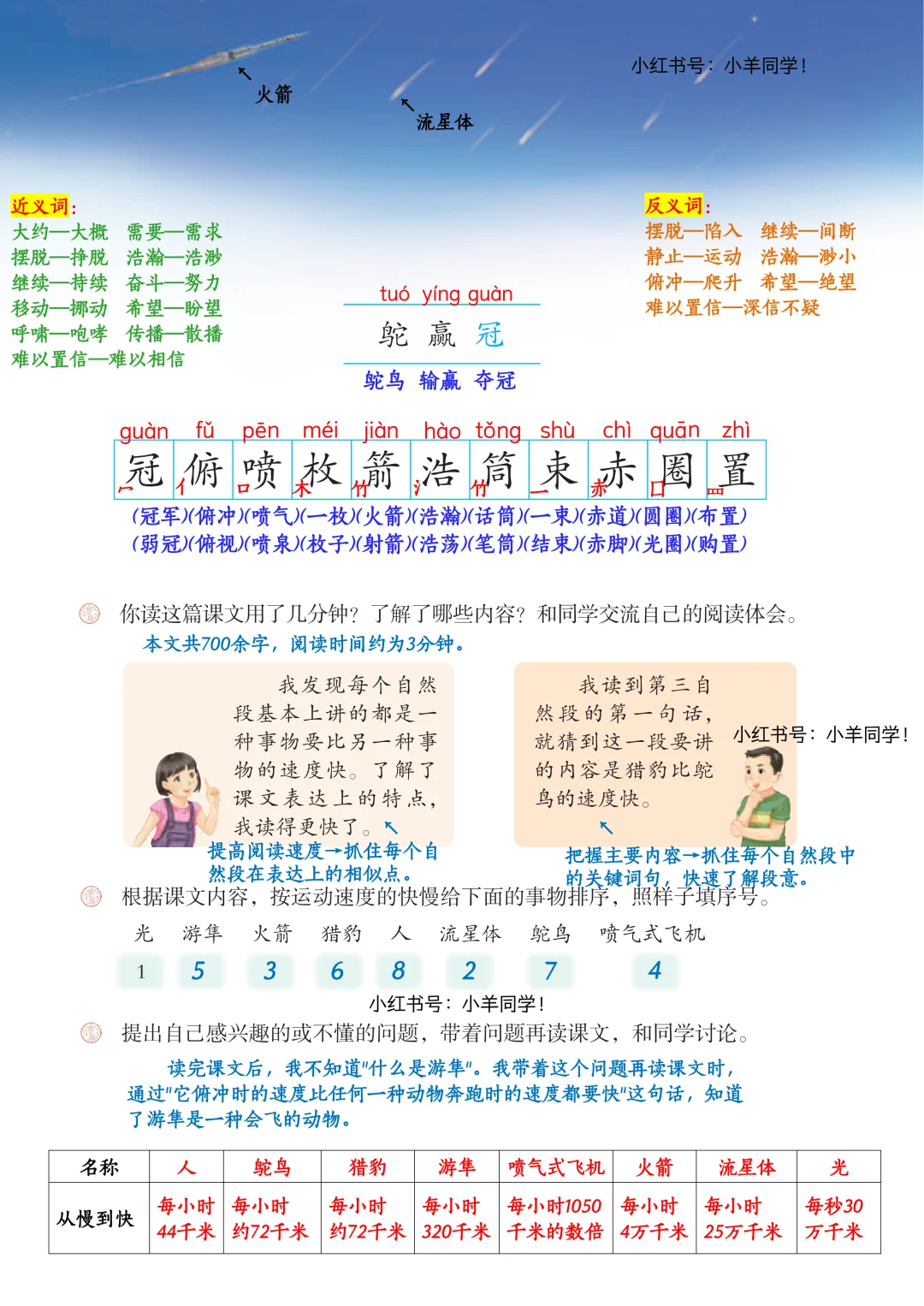 ✅学习目标: 🚩认识“鸵、赢”3个生字,读准多音字“冠”,会写“冠、俯”等11个字,会写“猎豹、冠军”等词语。 🚩能借助关键词句提高阅读速度,了解主要内容。(重点) 🚩能针对课文内容提出自己的问题。 🚩体会课文在表达上的特点,学习作比较、列数字等说明方法。 ⚠️原创整理,禁止转载发布网络平台或商用。