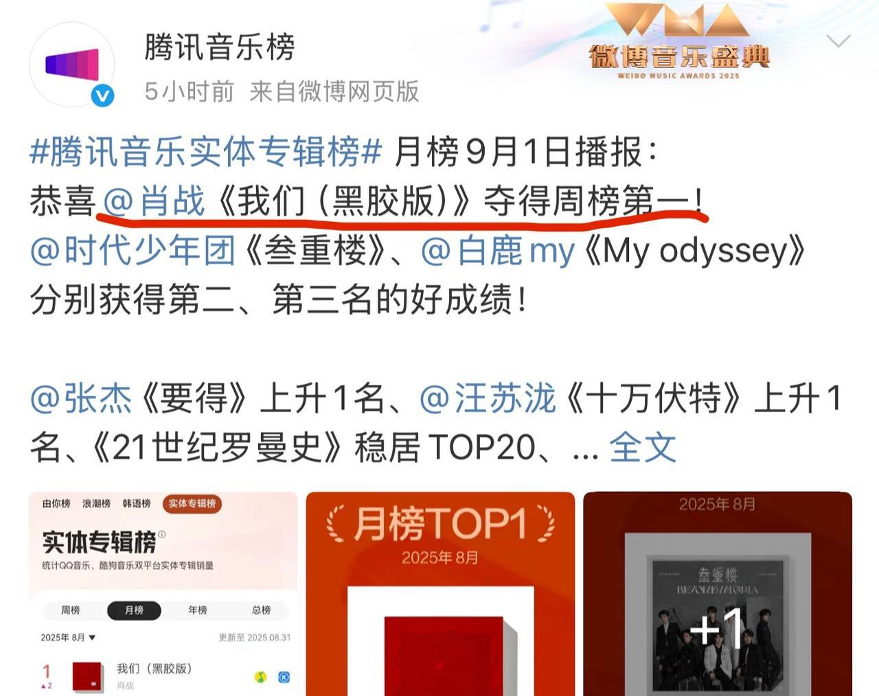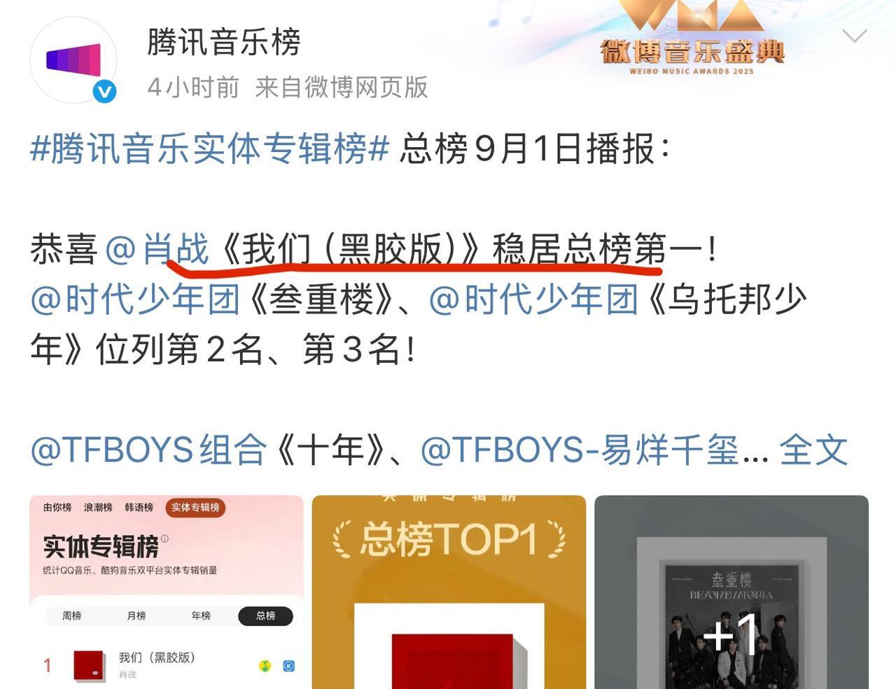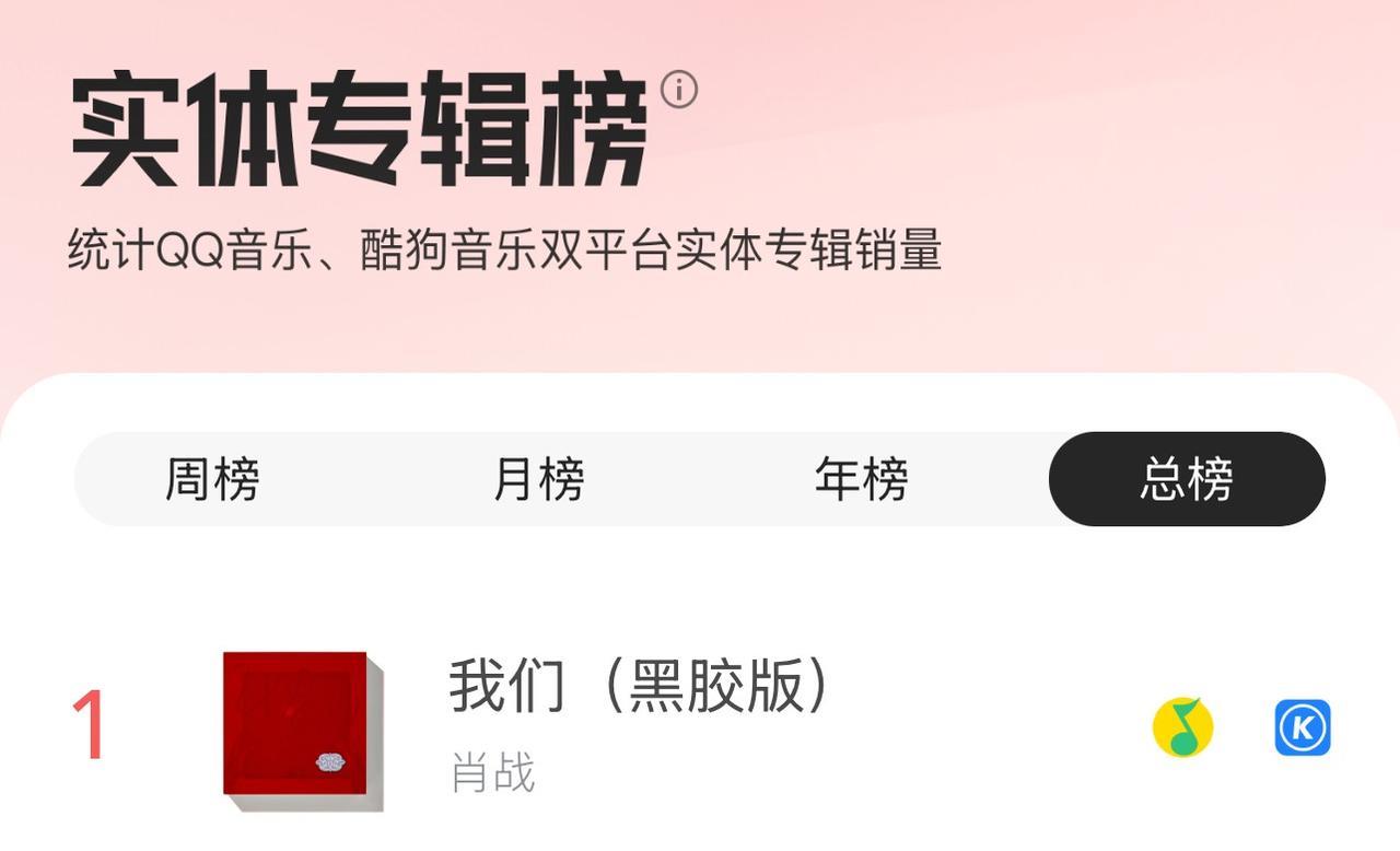 肖战去年发布的音乐实体专辑《我们》,时至今日,稳居腾讯音乐榜总榜第一,月榜第一,周榜第一! 快一年了,还这么能打,说明不断有新粉入场。今年的《藏海传》大爆特爆,演员肖战的音乐之路也是收获满满。#肖战#