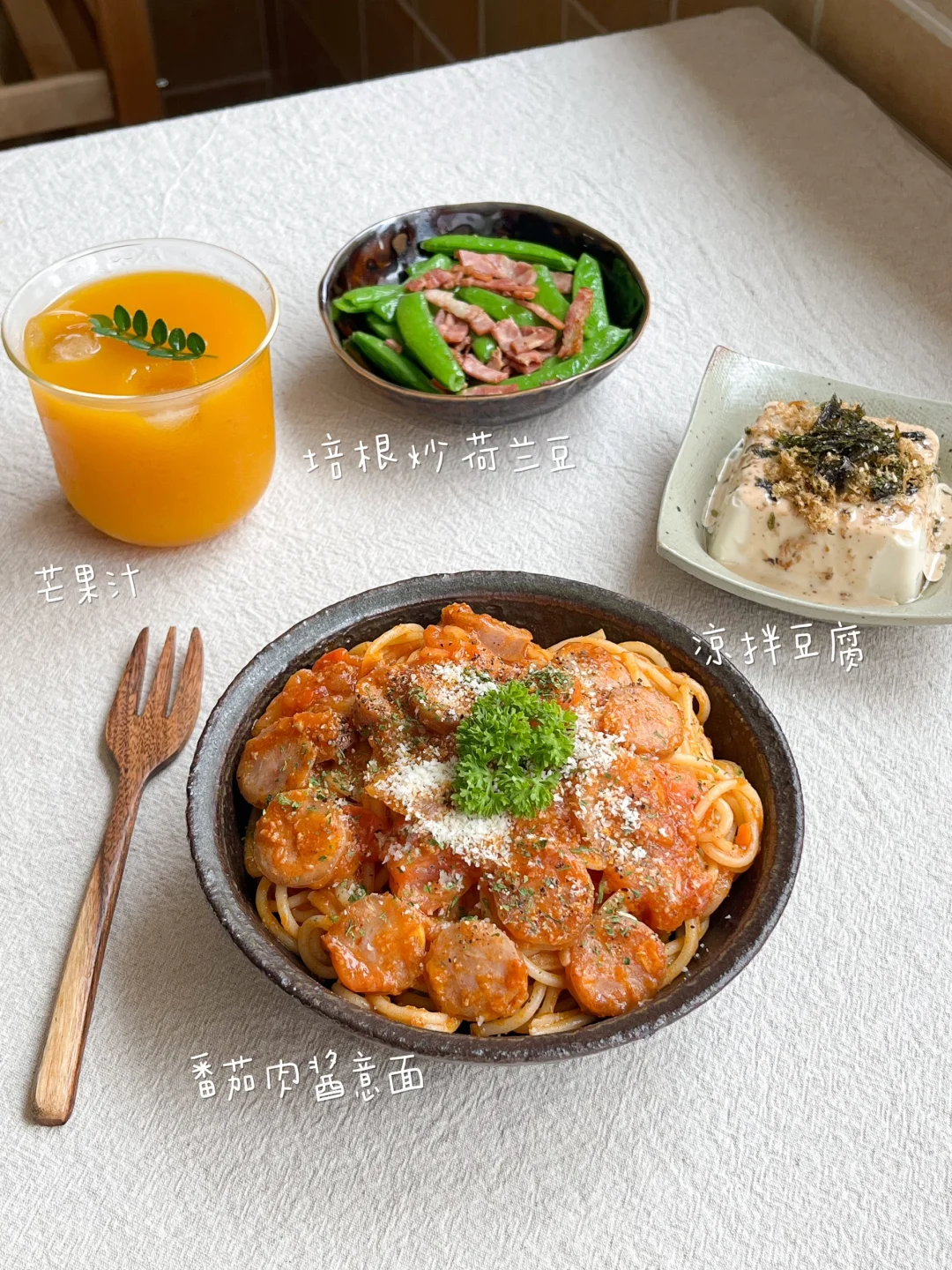 我是北方姑娘 喜欢吃米也喜欢吃面 也愿意尝试各种各样新鲜的食物和吃法 整理了最近的一人食餐桌 都有做法呦 每天不知道吃什么 可以来看看我~ 番茄肉酱意面🍝 培根炒荷兰豆🥓 凉拌豆腐🫘 芒果汁🍹 黑胡椒牛柳意面🥩 豆乳蔬菜汤🥣 黄油南瓜🎃 柠檬气泡水🍋 蘑菇烤牛肉饭🥘 豌豆滑蛋🥚 味增烤豆腐🍞 茉莉豆乳🥛 藕饼煎蛋饭🧄 柴鱼豆腐🐟 金枪鱼番茄沙拉🍅 菠菜蘑菇汤🥬 偶尔米饭吃腻了 就换空刻意面吃吃 自己在家做 可以随便加料DIY 番茄肉酱意面我喜欢搭配香肠、虾仁 黑胡椒牛柳适合白蘑菇、青椒、芦笋 每包酱料都很足 牛柳好大块的! 欧芹碎 芝士粉 海盐黑胡椒这些料包配的也很全 做出来的味道不输餐厅 简单干净又方便