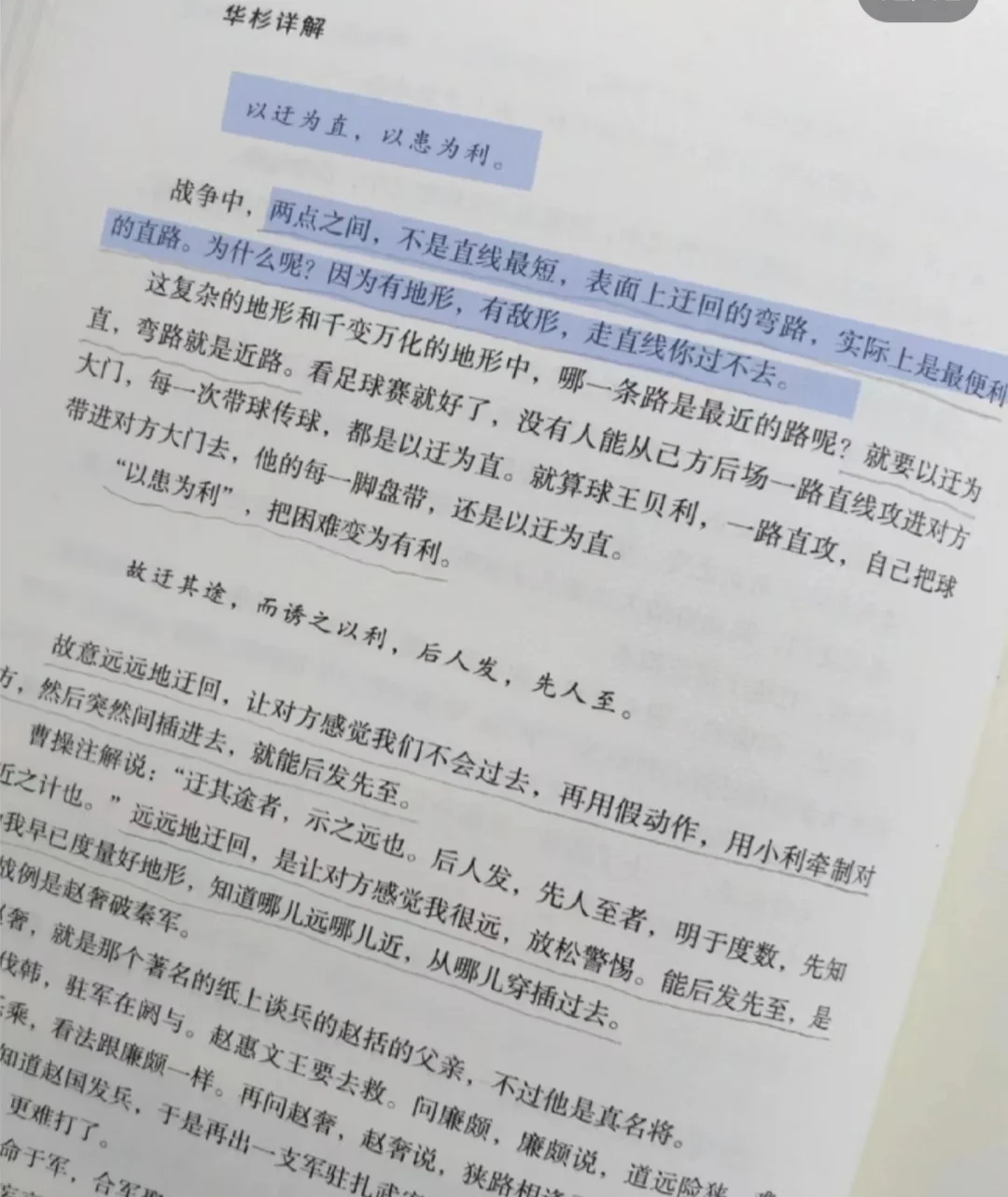 ”,华杉老师解释说,两点之间,因为有地形和敌情,表面上迂回的弯路,实际上是便利的直路,在战术上方便易守难攻。
