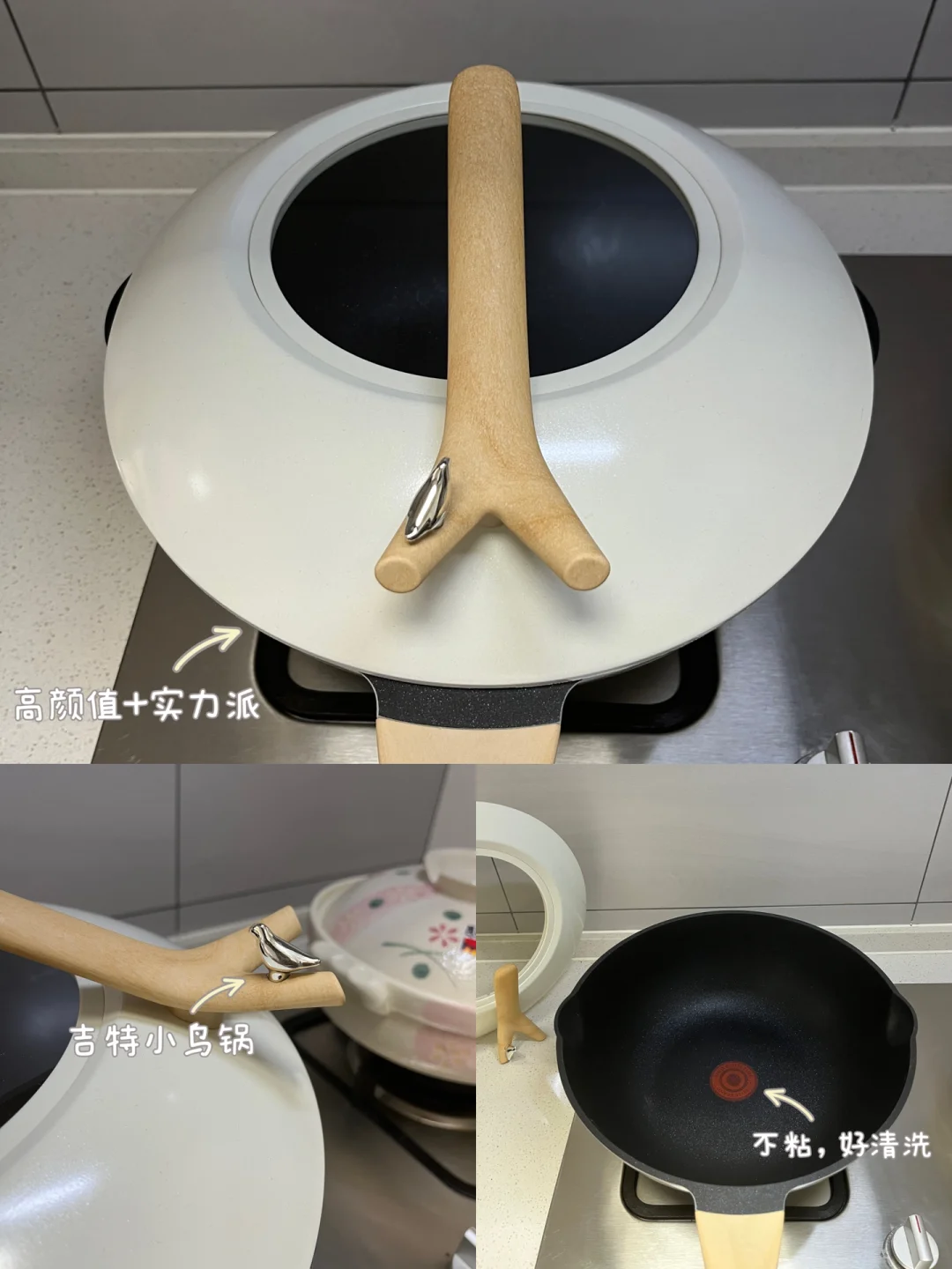 吉特小鸟锅用了一周左右了,忍不住再来反馈一下~每次做饭都忍不住夸自己眼光真是不错~锅子的内外都是陶瓷不粘涂层的,不仅锅内不粘性好,而且锅身不粘涂层也比较好清洗,完全不用担心白色的锅不好洗的问题~另外它比我之前用的其他不粘锅要更深一些,容量大,适合一般家庭的做饭需求~给你们看一下手柄上的小鸟,真是太精致啦~