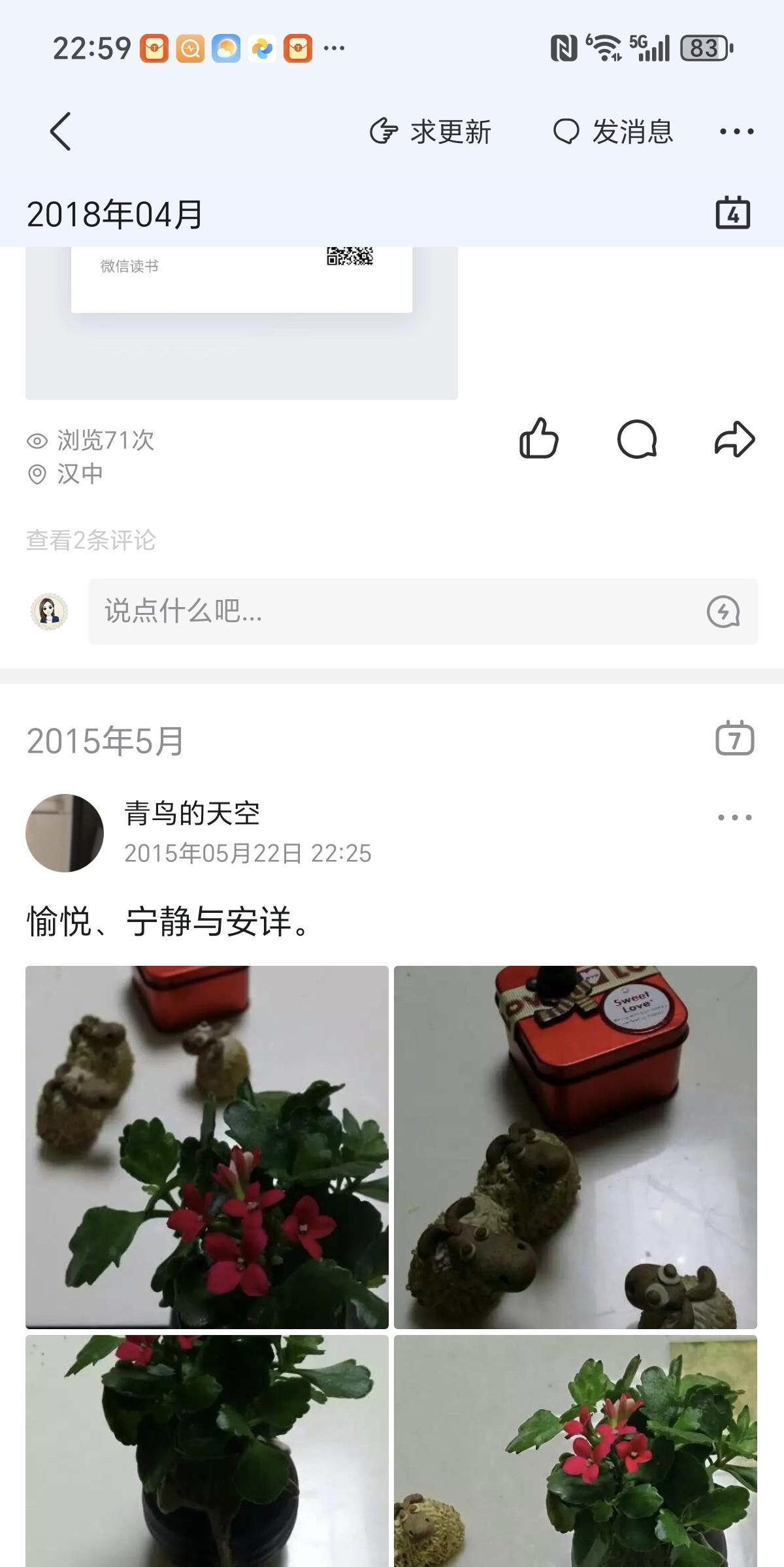 打开QQ,睡意全无 这是我的一个网友,她的空间永远定格在2018年,她已经走了快八年,但她一直留在我的QQ好友圈里,舍不得删除。 当初她是一个多么热爱生活的人,那会儿很多人喜欢微聊,但我俩喜欢用QQ聊,她是一个会计,我俩一起探讨育儿经验,一起分享理财心得,购物指南,讨论发型,讨论服装,谈论自己的老公,也谈论陕西与汉中的天气,就像一对失散多年的姐妹,相谈甚欢,无所不聊。 遗憾的是,2018年,一场疾病她永远的走了,这么多年过去了,我还是会想起她,想她的时候我会打开QQ看看,去她的空间留个言,翻看一下她当年拍摄的各种花草图,写的各种小文章。依然是那样的鲜活生动。 她活在我的QQ朋友圈,我不会删除她,永远都不会,就当她是一个没有WIFI信号上不了网的故友,阴阳两隔,情义永存!