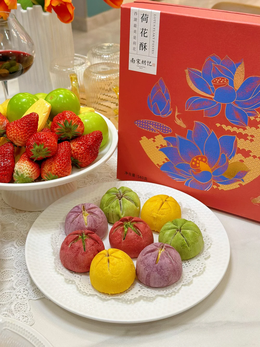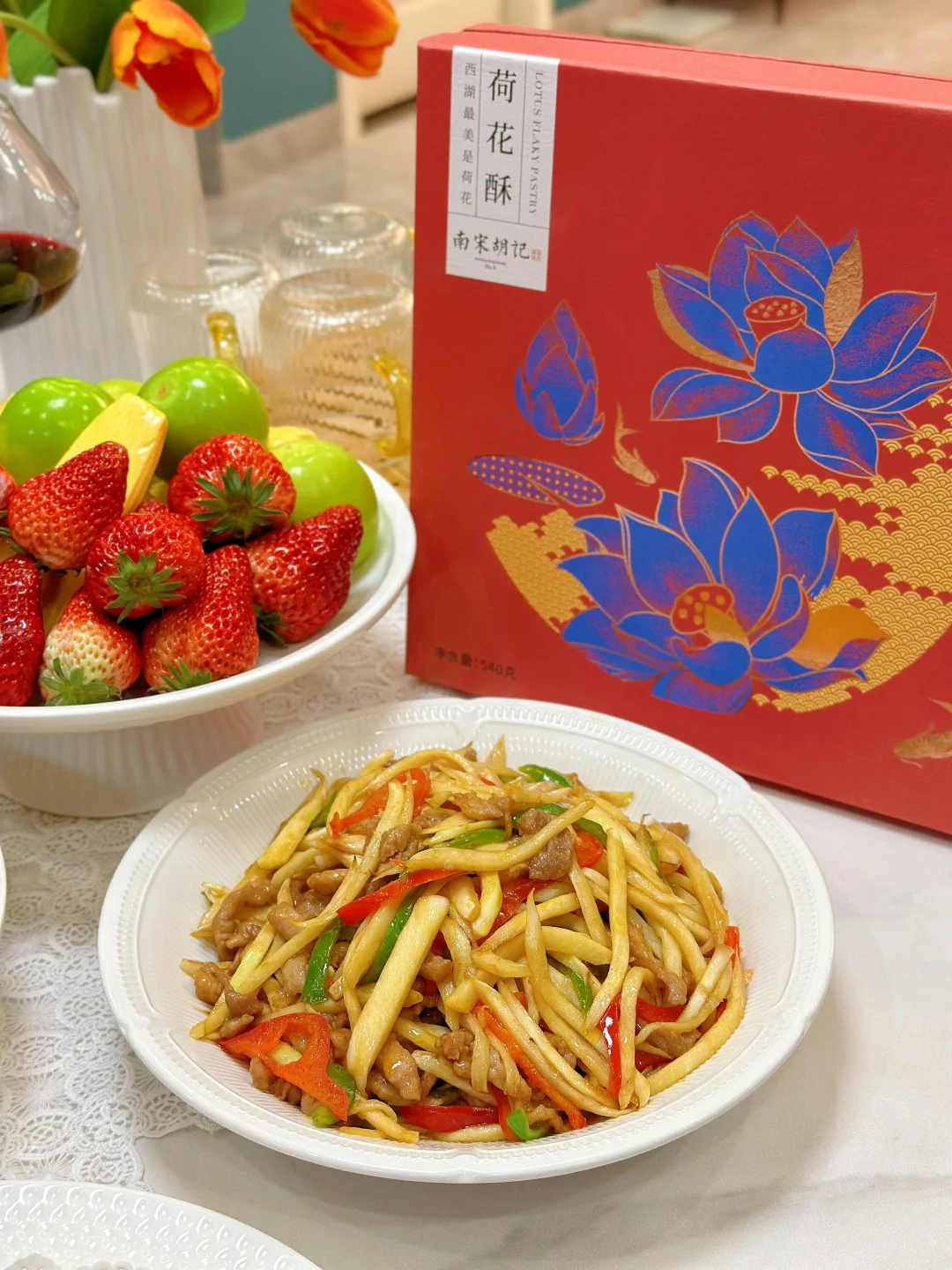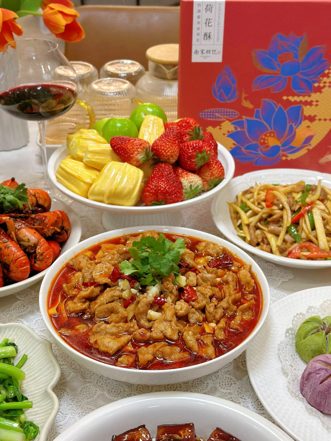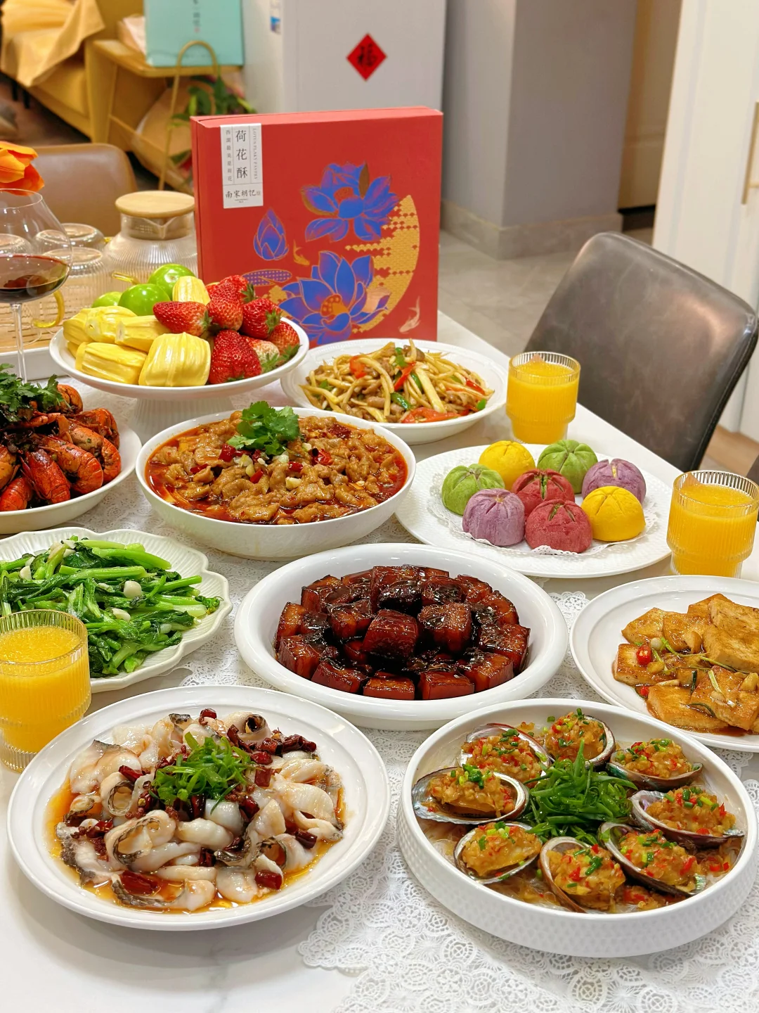 春光烂漫,邀请亲戚来家里吃饭,美食满桌,一起共赴一场春天的约会吧! 菜单分享 红烧肉🥩 清炒菜苔🥬 水煮肉片🥩 家常豆腐 香辣小龙虾🦞 茭白炒肉丝 葱油鱼片🐟 蒜蓉粉丝鲍鱼 南宋胡记荷花酥 水果拼盘🍓 春日的美好时光,和家人相聚在一起吃吃喝喝,这么美好的时光当然要有精致的点心作陪啦——南宋胡记荷花酥! 因为家里长辈都爱荷花,隔三差五爸妈就会买点荷花形状的糕点,这次我也给他们准备了好吃的荷花酥,想着爸妈肯定会很喜欢,每个糕点就好像初绽的荷花花瓣,精致得让人移不开眼。一端上桌瞬间就吸引了家人的目光。轻轻一咬,外皮酥脆掉渣,内馅软糯香甜奶香味很足!而且选用的是新西兰黄油、蓝莓颗粒、云南重瓣玫瑰等优质食材入馅,口味丰富得很,每一口都能尝到江南的细腻风情哦~家人吃了都是赞不绝口! 在杭州,过年过节时,荷花酥更是送礼的热门选择呢,走亲访友时手里提上一盒荷花酥,不仅是满满的心意,又彰显着杭州的特色。平时宅家的下午茶,来上一块配茶,都再惬意不过。礼盒上绘制的荷花与锦鲤纹样,南宋韵味满满,送朋友也超有面儿!这不又准备再买两盒,等下个月踏青野餐时带上它,可是一道拍照超上镜的美食道具呢!