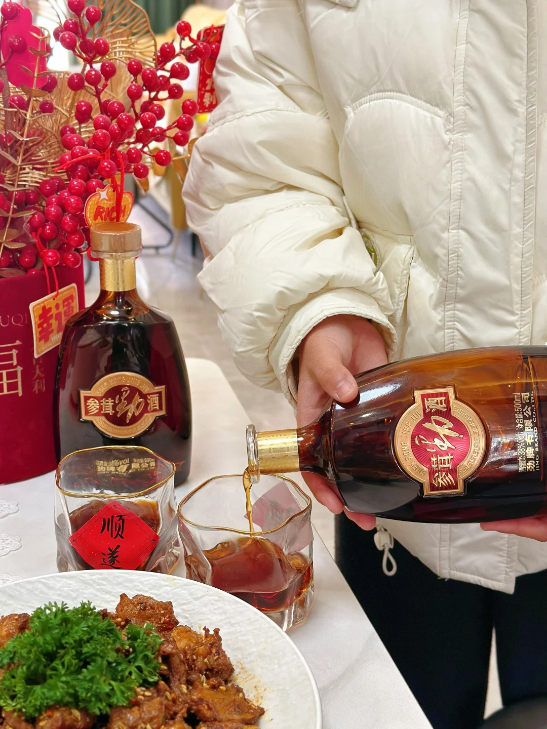趁着今天一吃团圆饭,陪着爸妈一起喝两口。参茸劲酒中的草药香在桌上里散开,温馨的氛围感立马有了,一家人唠着嗑,喝着酒,暖身又舒心!