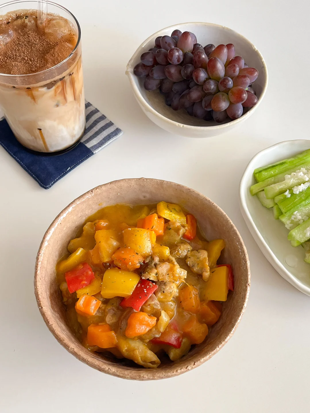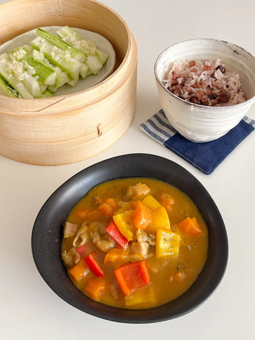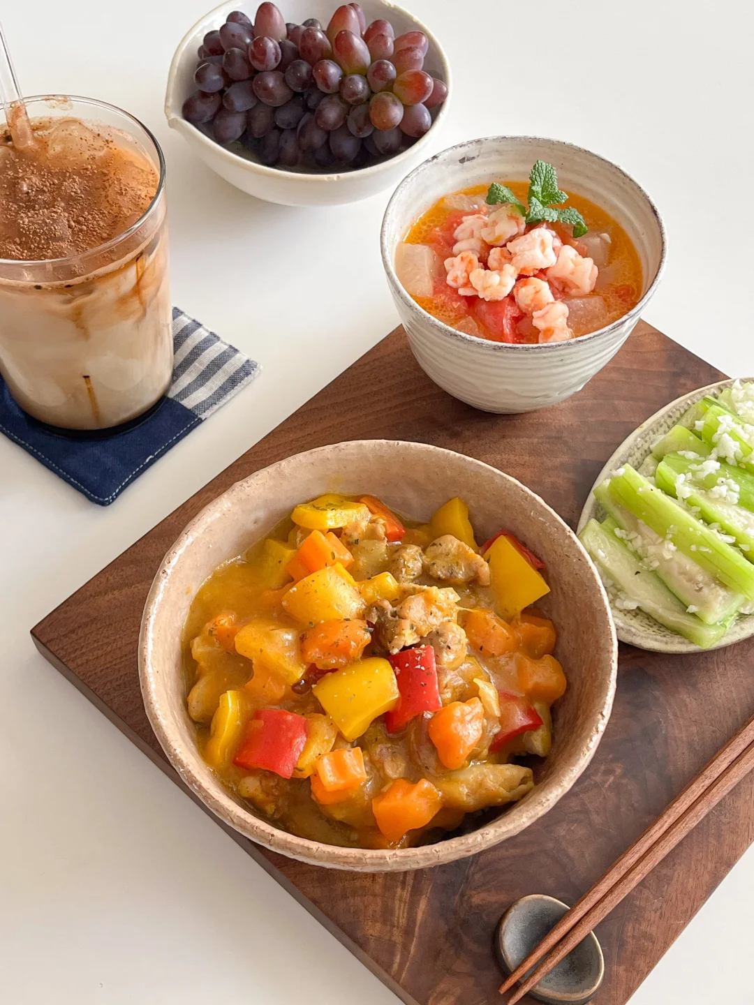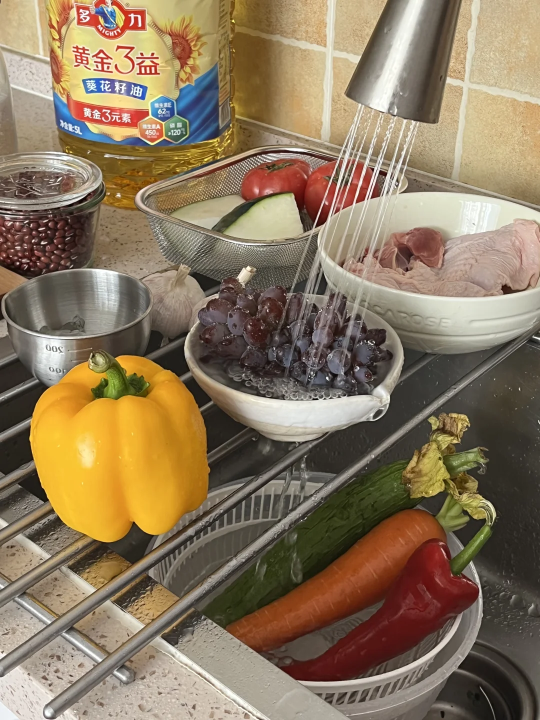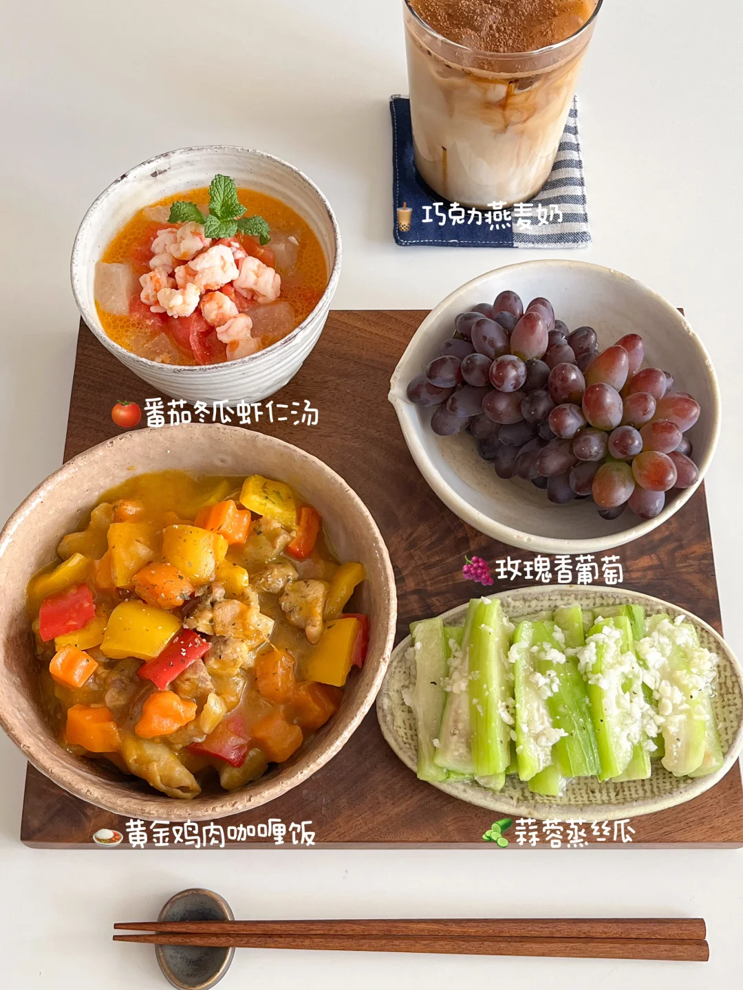 今天的饭: 红豆薏米饭🍚 黄金咖喱鸡🥘 番茄冬瓜虾仁汤🍅 蒜蓉蒸丝瓜🥒 巧克力燕麦奶🧋 做锅红豆薏米饭 提前一夜泡好了红豆和薏米 煮饭之前 先用养生壶把薏米红豆煮15分钟 一会焖饭也好熟 还可以得到一杯热茶~ 我很喜欢现在的生活 有时间就早起 拎个菜篮慢慢逛着早市 有很多新鲜的蔬果 夏天出汗多 就吃点苦瓜、番茄、冬瓜、绿豆 还要保证好每天的蛋白质和25-30g油脂 其实选对好油比少吃油更重要 多力是国民大品牌 一直精研食用油 用着也放心 这次还是买了一直在用的多力黄金3益小金瓶 健康的食谱也得搭配上健康好油 它有科学配比的黄金3元素 VA、VE和磷脂 营养堪比橄榄油 口感会更适合中国胃的养生小炒 做菜好吃负担小 凉拌、煮汤煎炒都OK 还有3重营养锁 锁住了营养才能吸收好营养 多力的葵花籽油烟点低 还获得了国家专利~ 毕竟夏天炒菜就怕油烟大 这下就不怕啦 刚好618了 价格很实惠 可以多囤点放在家里 这个夏天 用多力黄金3益小金瓶照顾好我的小餐桌吧