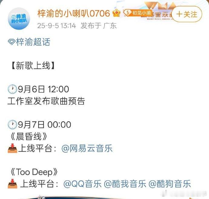 梓渝新歌上线预告梓渝两首新歌同时上线谁懂啊!梓渝两首新歌《晨昏线》《too deep》同时上线不同平台,这排面简直拉满!一首温柔抒情,一首活力动感,满足你不同的听歌偏好,这波必须冲!梓渝杂志